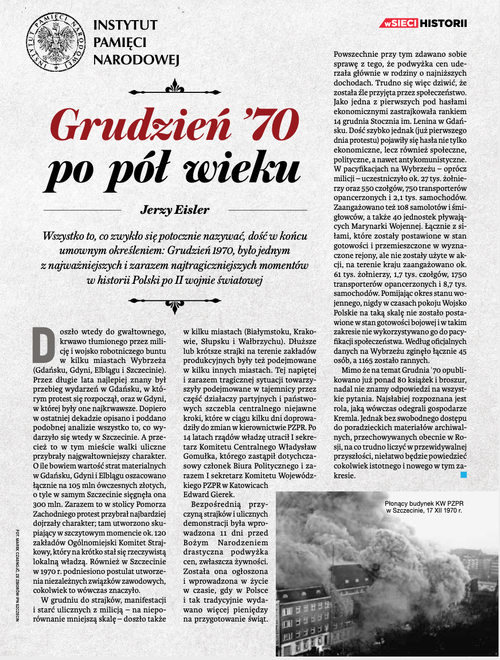 W kolejnym dodatku do magazynu "W Sieci Historii", tym razem poświęconym wydarzeniom z grudnia 1970 r., przedstawiamy ciekawe artykuły autorstwa: Jerzego Eislera, Grzegorza Majchrzaka, Sebastiana Ligarskiego, Radosława Petermana, Roberta Chrzanowskiego, Pawła Miedzińskiego i Tytusa Jaskułowskiego.