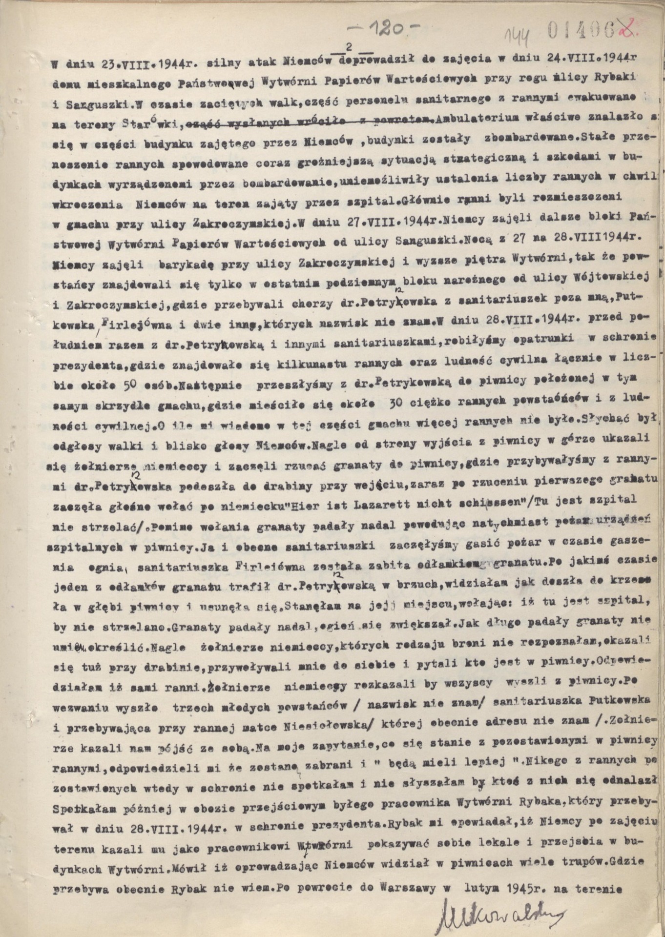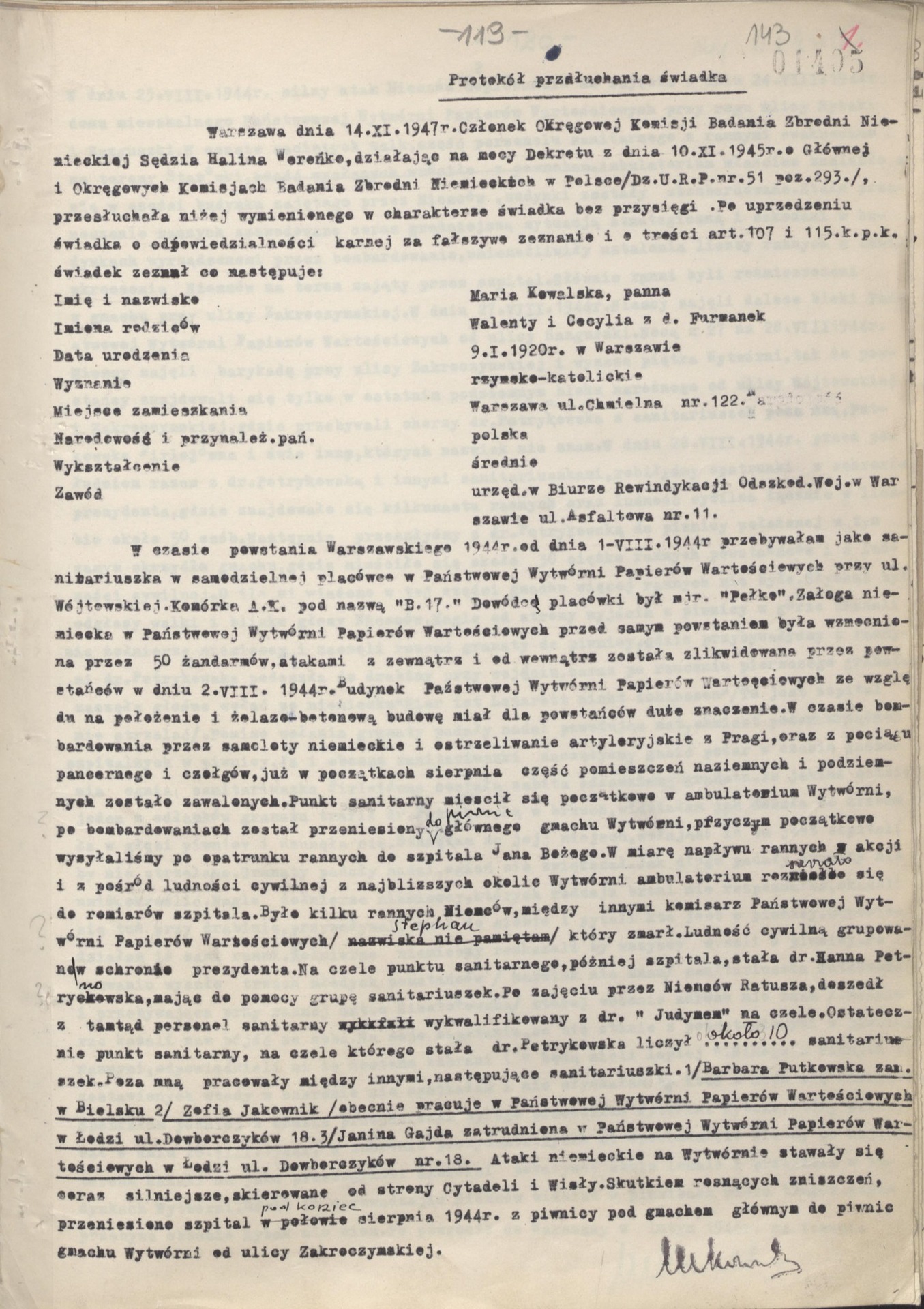Protokół przesłuchania świadka, Marii Kowalskiej, sanitariuszki współpracującej z dr Hanną Petrynowską w czasie powstania warszawskiego. Warszawa, 14 XI 1947 r. (z zasobu IPN)