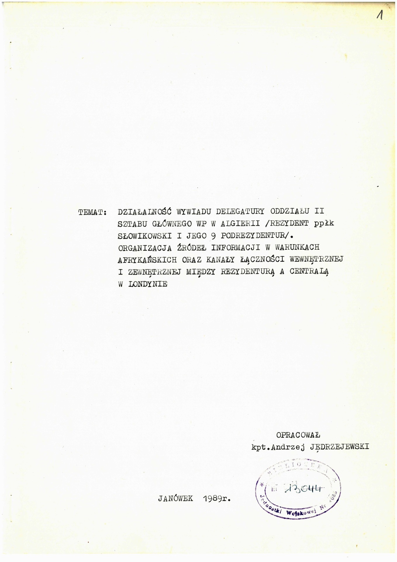 Strona tytułowa pracy kpt. Andrzeja Jędrzejewskiego pt. „Działalność wywiadowcza delegatury Oddziału II Sztabu Głównego WP w Algierii (rezydent ppłk Słowikowski i jego 9 podrezydentur). Organizacja źródeł informacji w warunkach afrykańskich oraz kanały łączności wewnętrznej i zewnętrznej między rezydenturą a Centralą w Londynie” (z zasobu AIPN)