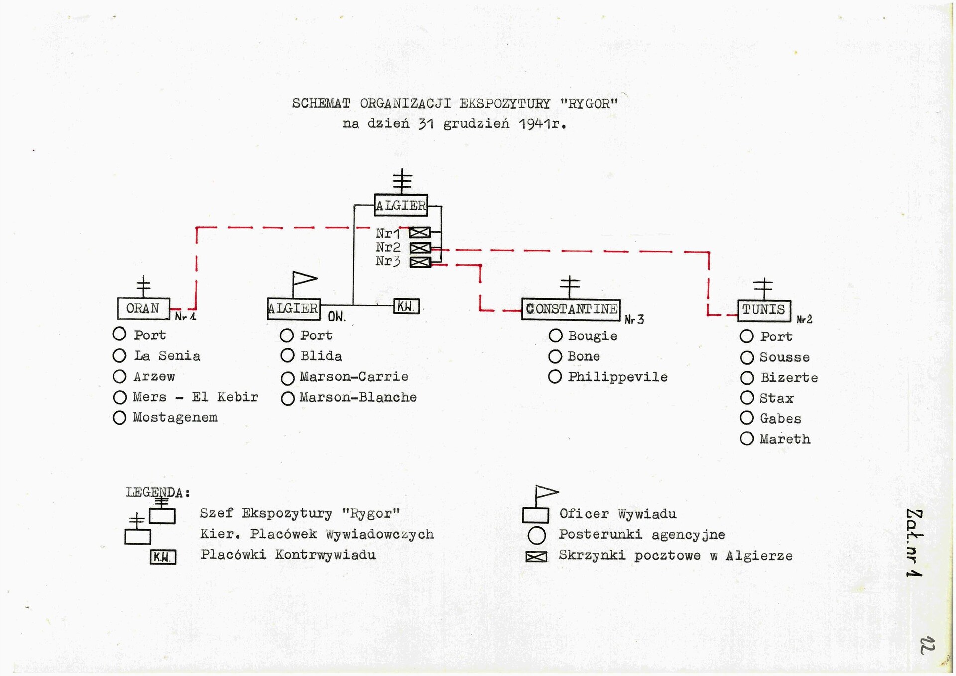 Schemat organizacji ekspozytury „Rygor” według stanu na 31 grudnia 1941 r. Z: Andrzej Jędrzejewski, „Działalność wywiadowcza delegatury Oddziału II Sztabu Głównego WP w Algierii (rezydent ppłk Słowikowski i jego 9 podrezydentur). Organizacja źródeł informacji w warunkach afrykańskich oraz kanały łączności wewnętrznej i zewnętrznej między rezydenturą a Centralą w Londynie” (z zasobu AIPN)