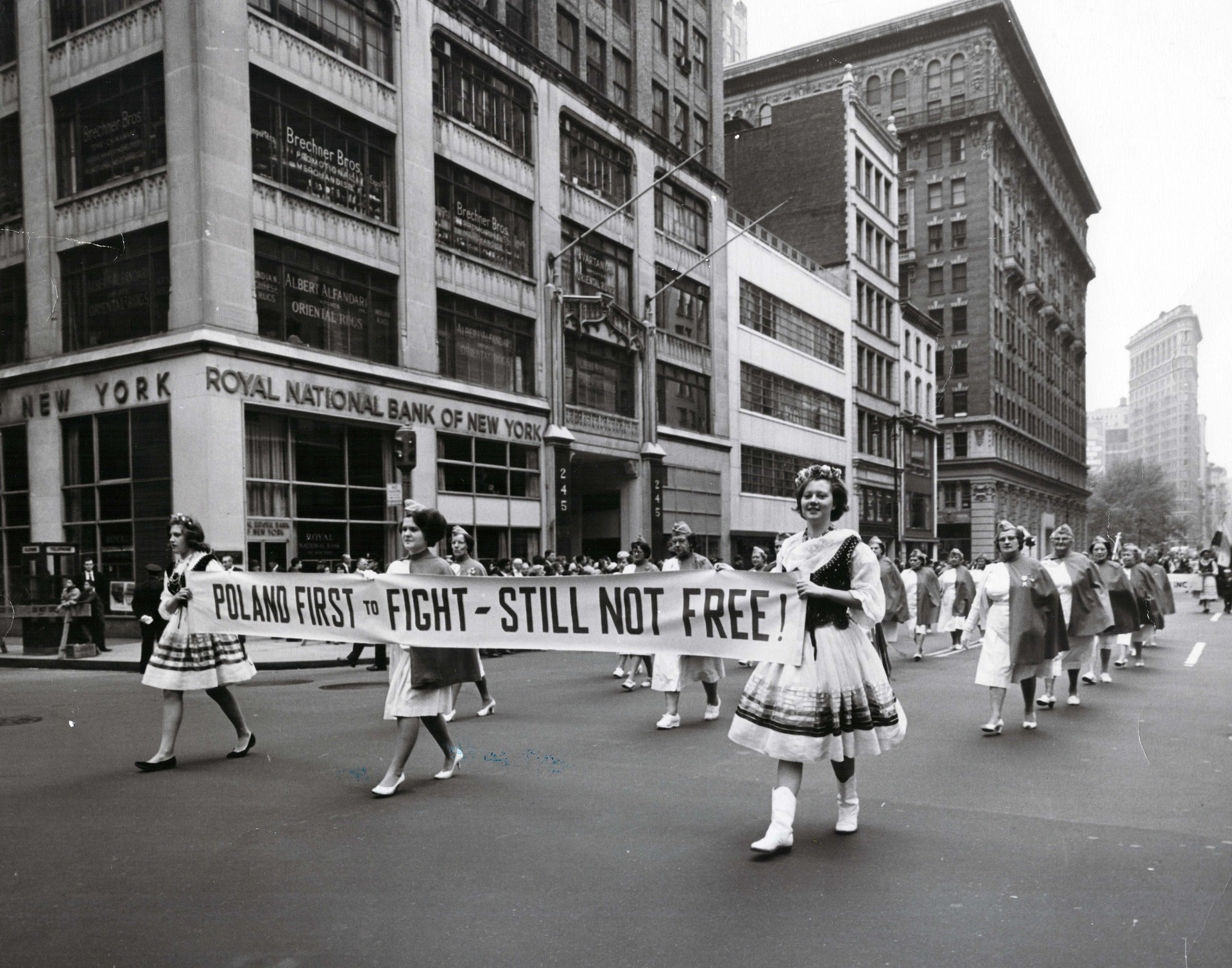 Kobiety z Korpusu Pomocniczego Pań przy Stowarzyszeniu Weteranów Armii Polskiej w Ameryce (SWAP) w Paradzie Pułaskiego przy 5 Alei na Manhattanie w Nowym Jorku, niosą baner z napisem po angielsku: „Poland first to fight – still not free” (Polska pierwsza w walce – wciąż nie jest wolna). Fot. z zasobu IPN, ze zbioru kopii cyfrowych fotografii przekazanych do IPN przez Stowarzyszenie Weteranów Armii Polskiej w Ameryce