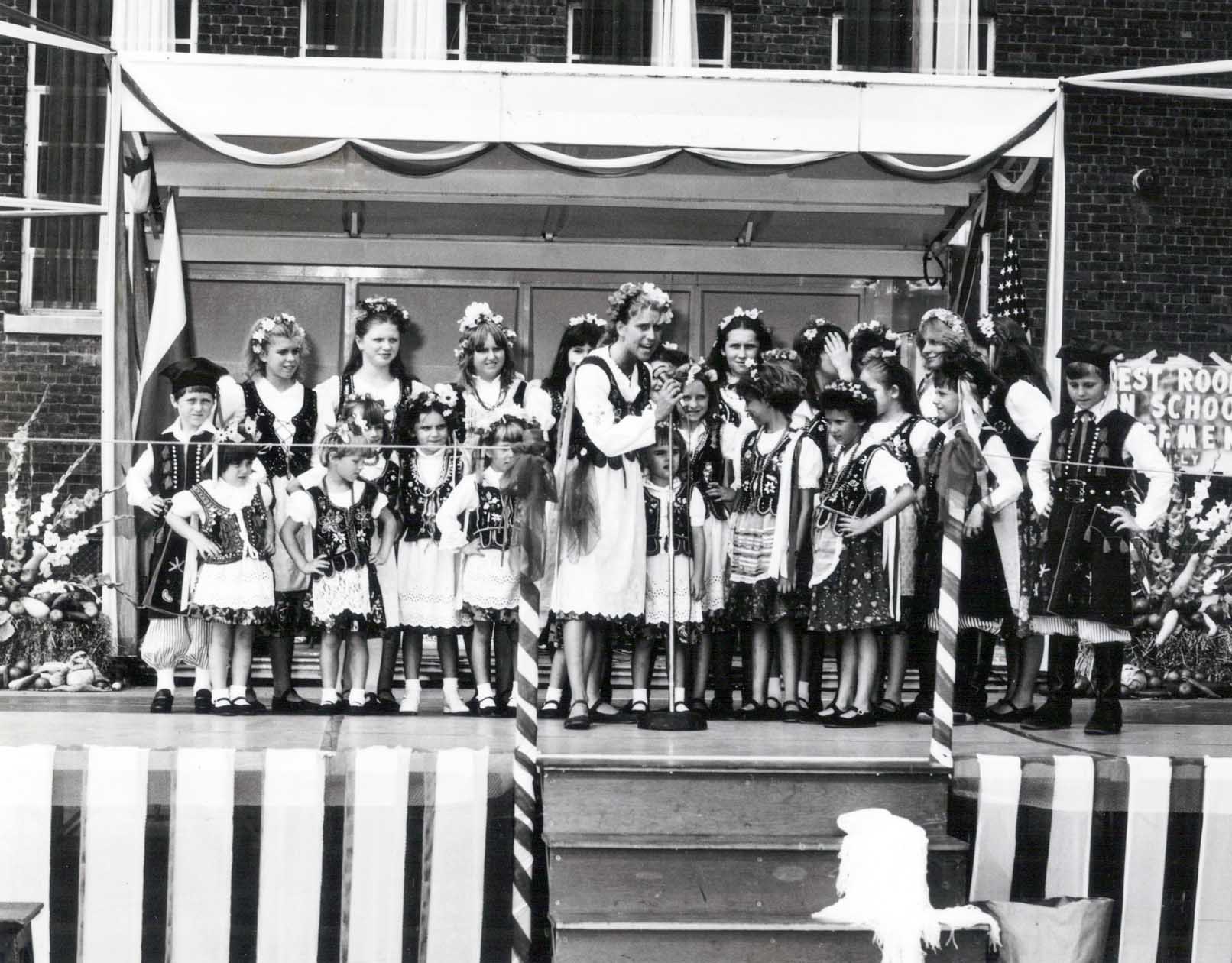 Dziecięcy Zespół taneczny „Orlęta” w polskich strojach ludowych z 24. Placówki SWAP w Bridgeport w Stanach Zjednoczonych, 1975-1985 r. Przy mikrofonie kierowniczka zespołu Donna Knapczyk. Fot. z zasobu IPN, ze zbioru kopii cyfrowych fotografii przekazanych do IPN przez Stowarzyszenie Weteranów Armii Polskiej w Ameryce.