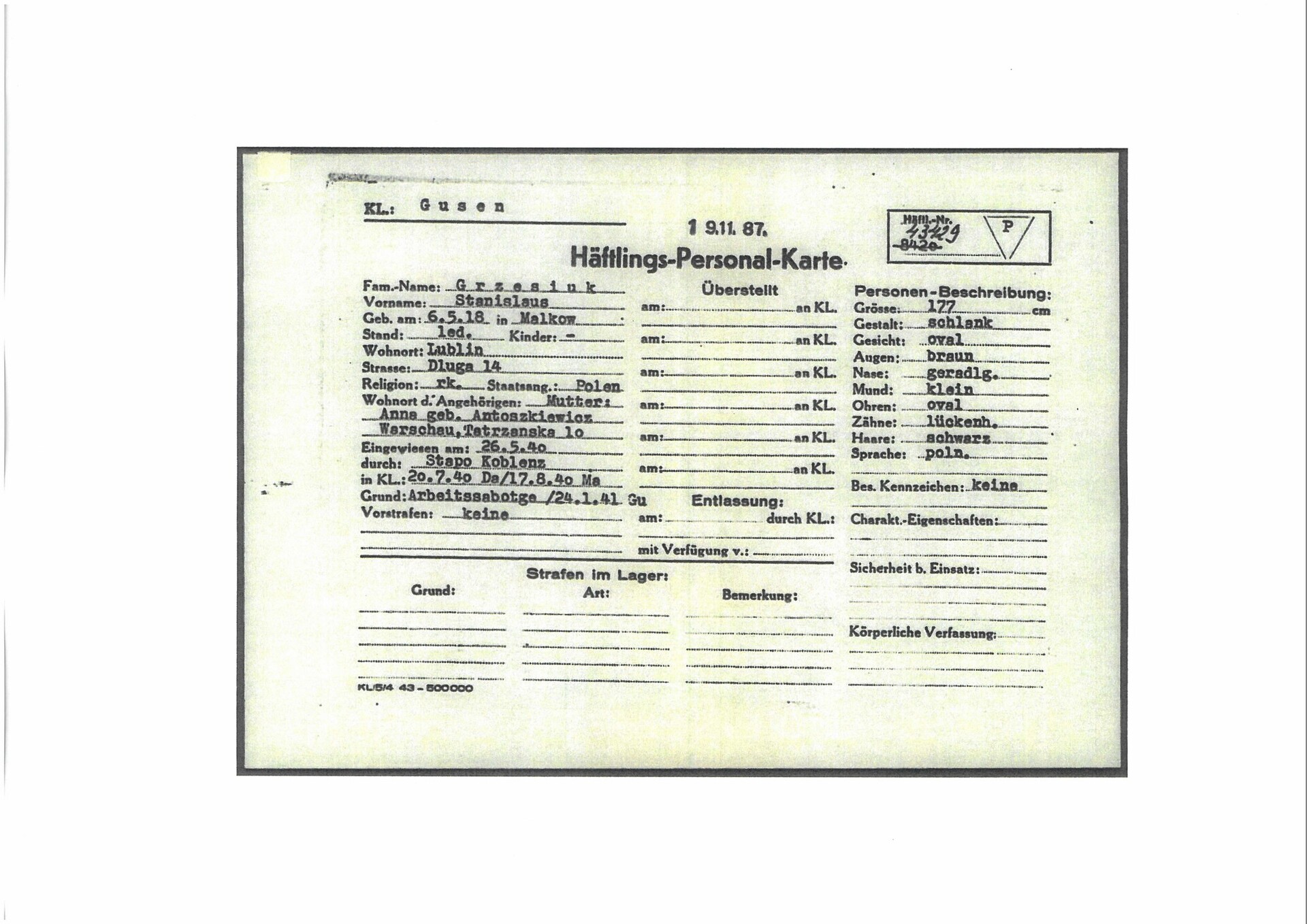 Karta obozowa Stanisława Grzesiuka, pochodząca z zespołu: Zbiór „Ob” (akt obozowych i więziennych) zawierający fragmenty akt niemieckich wytworzonych przez kancelarie obozów i więzień lub urzędy związane z ich działalnością