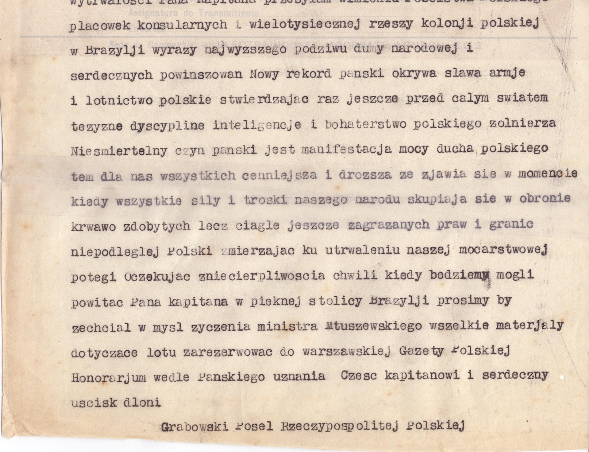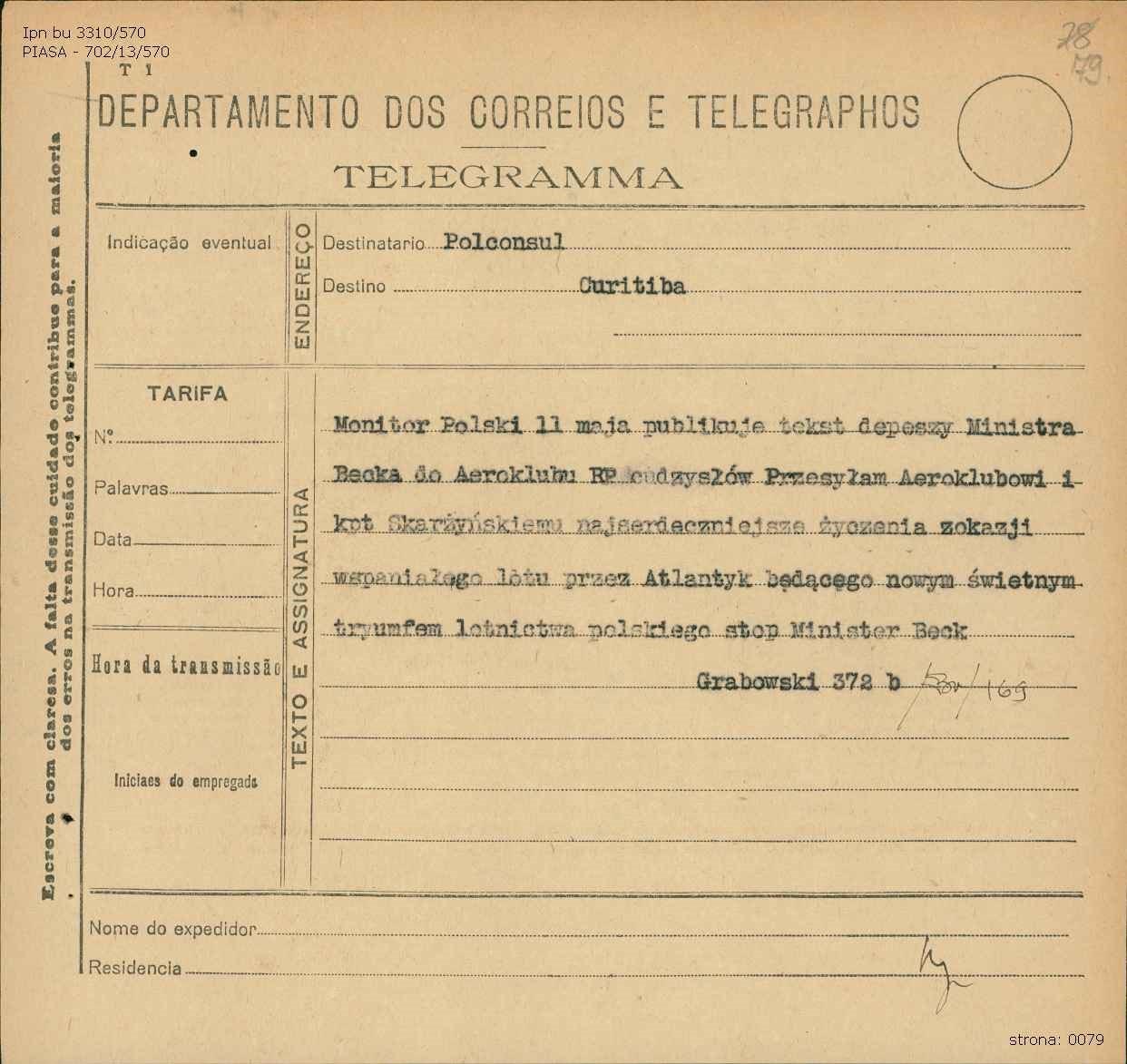 Radiotelegram do Ilustrowanego Kuriera Codziennego dotyczący przebiegu lotu i powitania kpt. Skarżyńskiego w Brazylii (z zasobu AIPN)