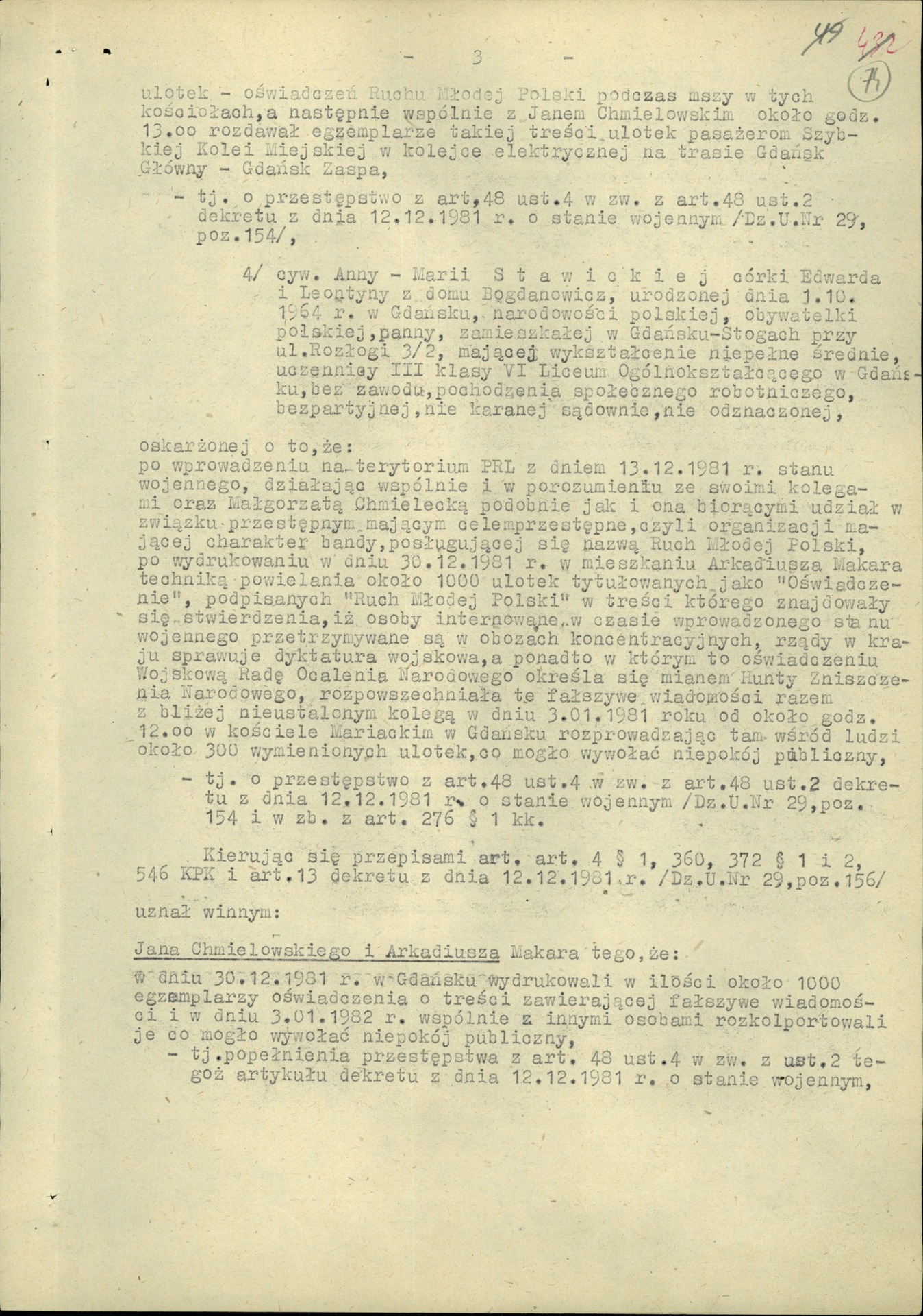 „iż w sprawie Anny Stawickiej brak jest jakichkolwiek bezpośrednich dowodów stwierdzających fakt, iż wymieniona w dniu 3 stycznia 1982 r. w Gdańsku kolportowała oświadczenie podpisane »Ruch Młodej Polski«, a zawierające w swej treści fałszywe wiadomości, mogące wywołać niepokój publiczny”.