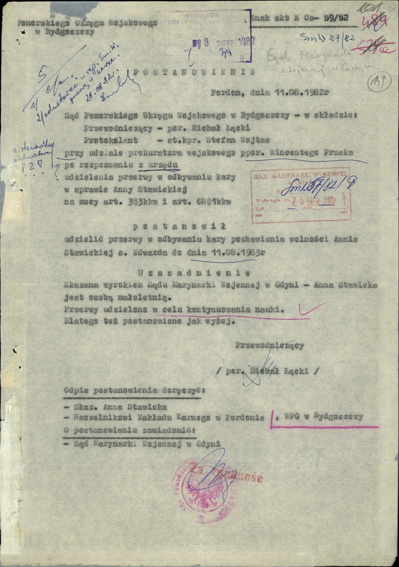 Ostatecznie Anna Stawicka przebywała w więzieniu w Fordonie kilka miesięcy. W dniu 11 sierpnia 1982 r. Sąd Pomorskiego Okręgu Wojskowego w Bydgoszczy wyraził zgodę na roczną przerwę w odbywaniu kary więzienia ze względu na konieczność kontynuowania przerwanej przez nią nauki. W lipcu 1983 r. Sąd Marynarki Wojennej w Gdyni ponownie rozpatrzył jej sprawę i wydał wyrok uniewinniający orzekając: