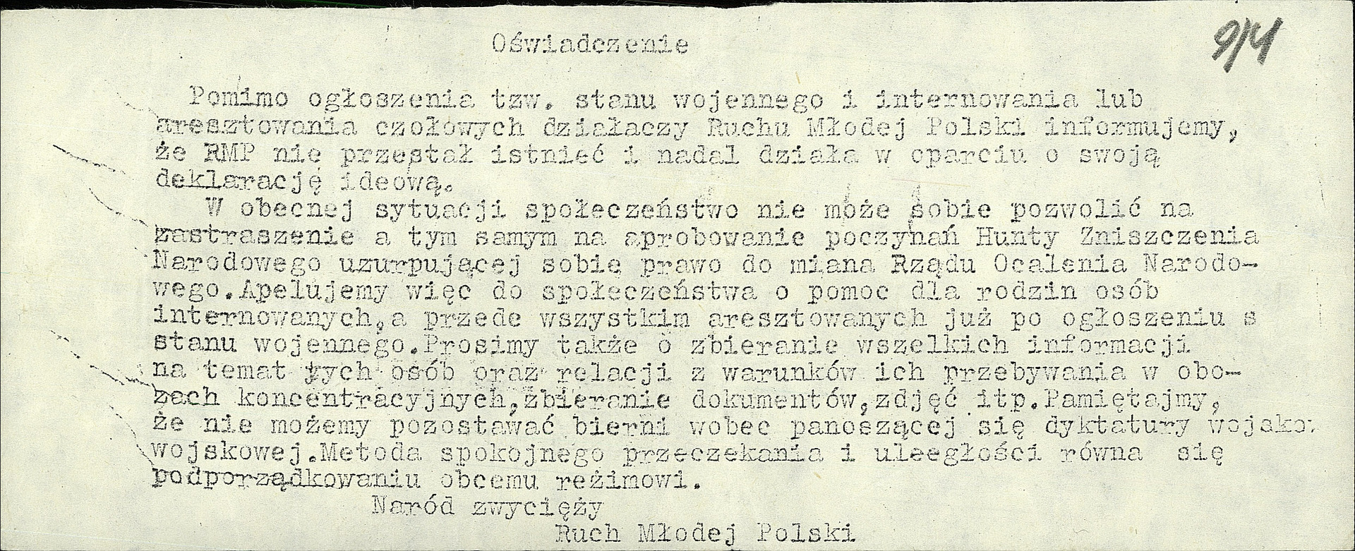 „tytułowane jako »Oświadczenie« podpisane Ruch Młodej Polski, w treści którego znajdowały się stwierdzenia, iż osoby internowane w czasie wprowadzonego stanu wojennego przetrzymywane są w obozach koncentracyjnych, rządy w kraju sprawuje dyktatura wojskowa, a ponadto w którym Radę Ocalenia Narodowego określa się mianem Hunty Zniszczenia Narodowego”.