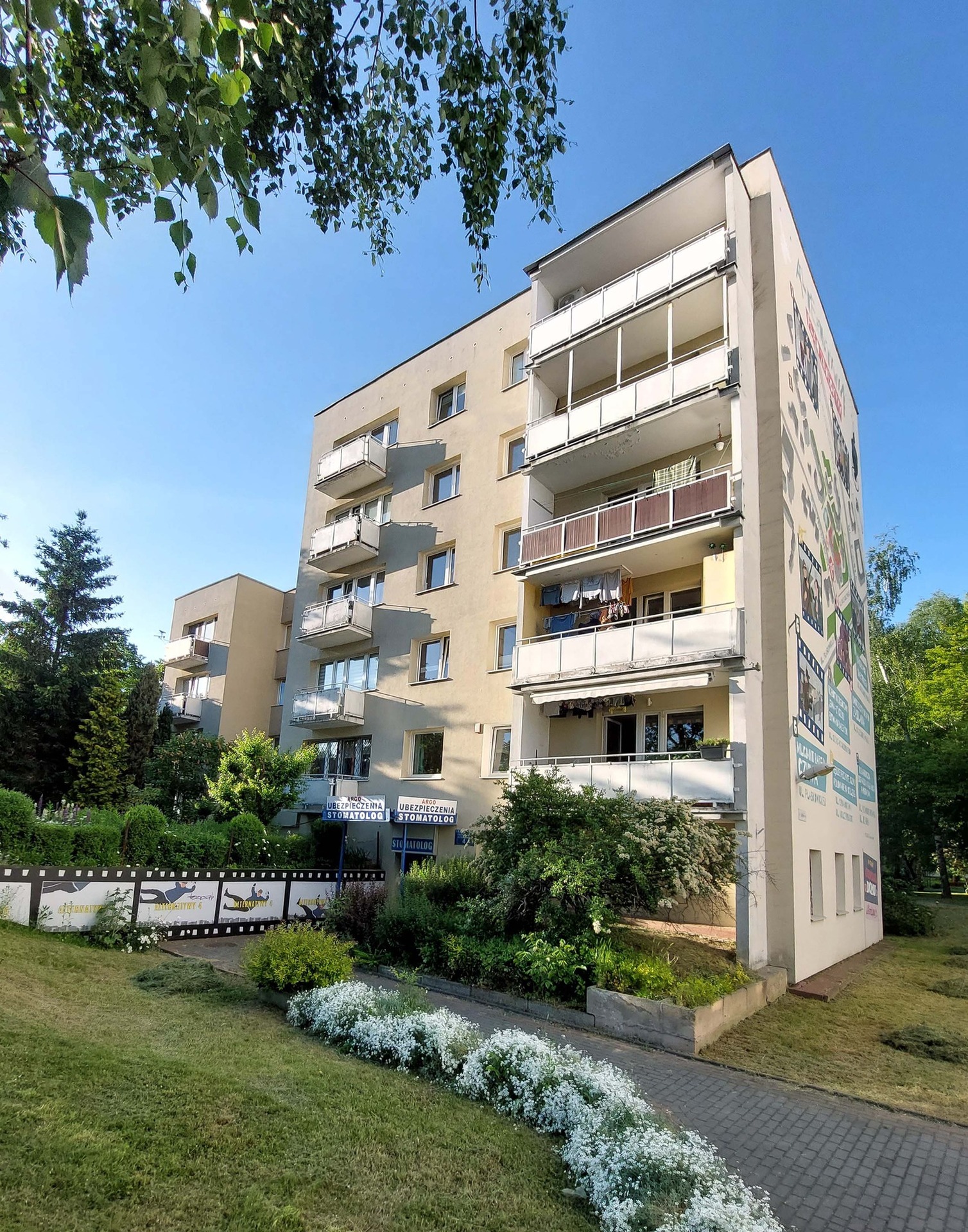 Boczna ściana bloku przy ul. M. Grzegorzewskiej 1 znajdującego się w sąsiedztwie budynku, w którym kręcono sceny do serialu. Mural został sfinansowany przez Dzielnicę Ursynów M. st. Warszawy w ramach budżetu partycypacyjnego. Autorem projektu murala jest Bartek Podlewski (fot. P. Zielony, IPN; 2023 r.)