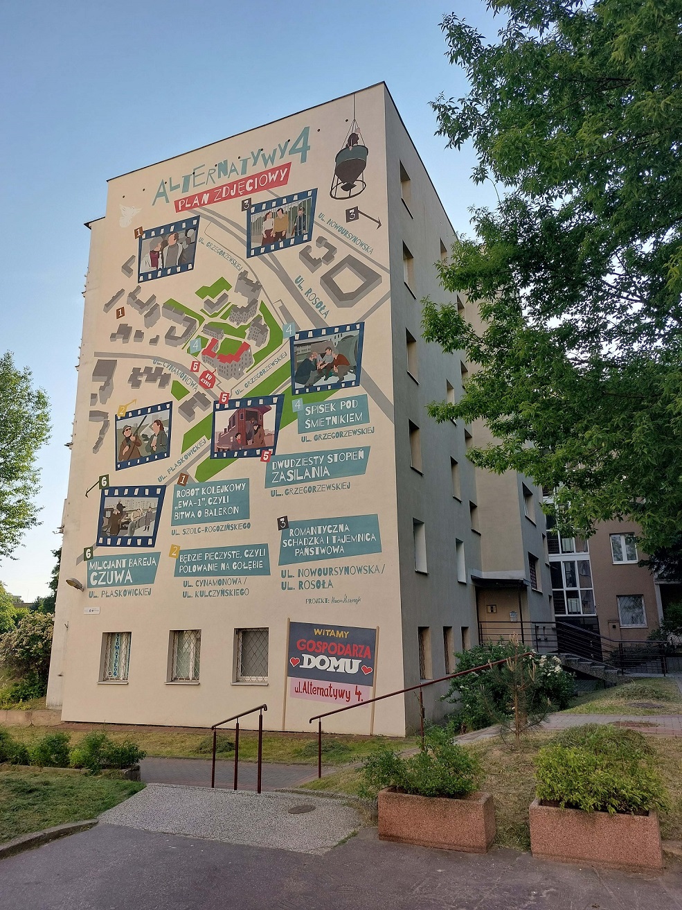Mural na ścianie bloku, w którym realizowany był serial „Alternatywy 4”. Przedstawia lokalizację miejsc na Ursynowie, w których kręcono poszczególne sceny. Uwieczniony został także reżyser serialu. Projekt elewacji został sfinansowany przez Dzielnicę Ursynów m.st. Warszawy w ramach budżetu partycypacyjnego. Autorem projektu murala jest Marcin Ślusarczyk (fot. P. Zielony, 2023 r.)