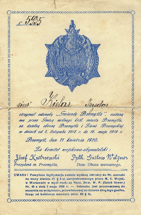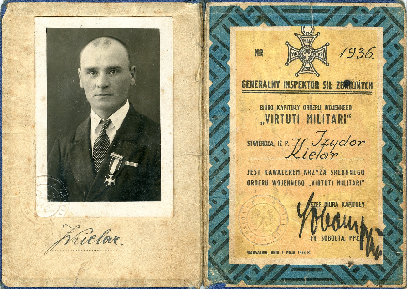 „W czasie kontrakcji 1. K[ompanii] K[arabinów] M[aszynowych] 18. pp […] na Oziernicę, obok Słonimia w dniu 22 lipca 1920 r. Kielar Izydor wysłany z patrolem, jako ubezpieczenie prawego skrzydła, natknął się na większy oddział bolszewicki, który przedzierał się lasem na tyły komp[anii], śmiałym atakiem powstrzymał jego marsz, zawiadomił wczas swój oddział, który stosownie do ugrupowania sił nieprzyjacielskich zarządził swój manewr, powstrzymując nieprzyjaciela w oskrzydleniu [oddziałów polskich]”.