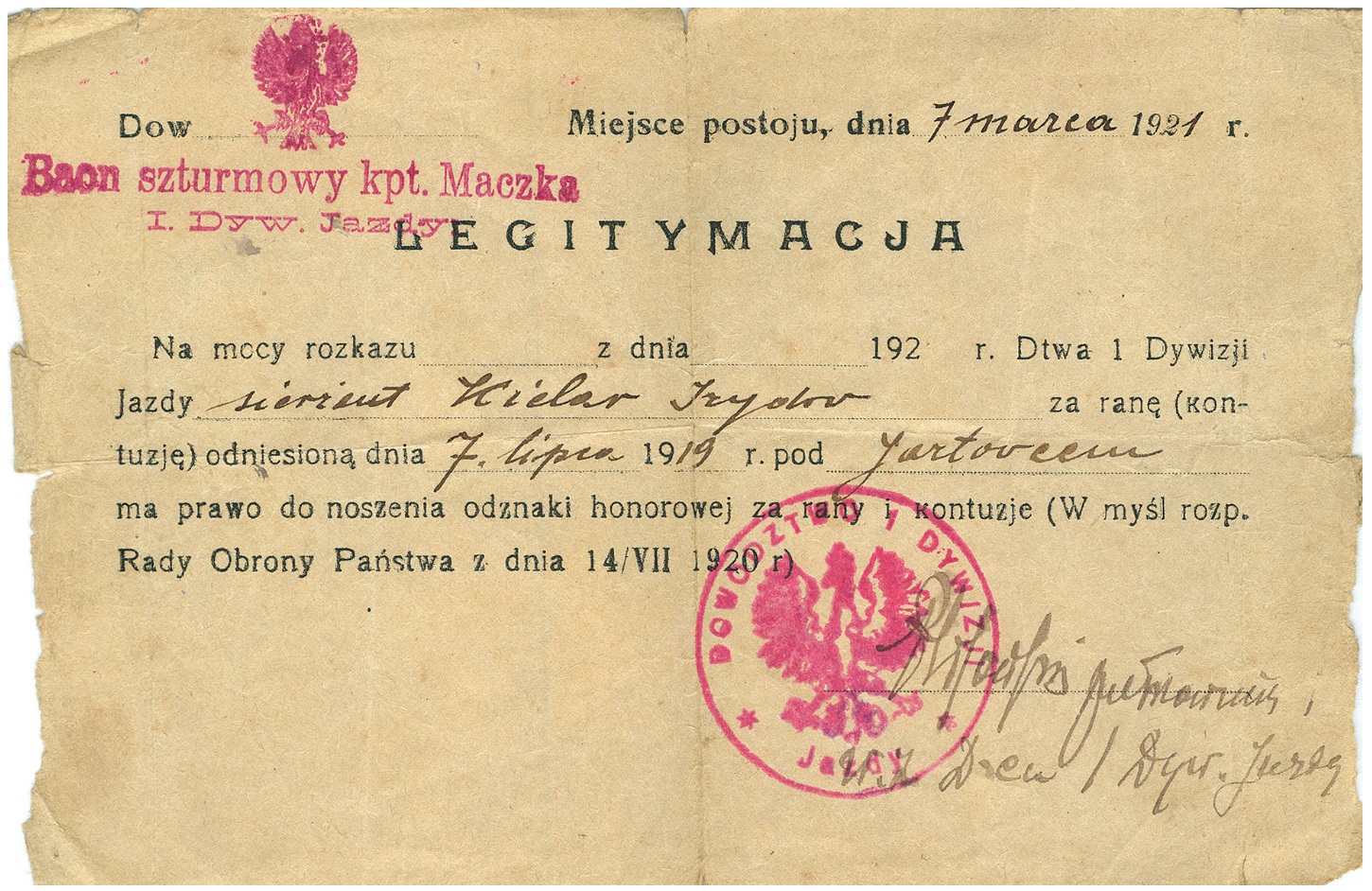 „Pod Jazłowcem dnia 6 lipca 1919 r. [kapral] Izydor Kielar idąc na szpicy patrolu komp[anii] lotnej 4-tej D[ywizji] P[iechoty] prowadzonego przez pchor. Zawadowskiego […], wpadł pierwszy do okopów batalionu ukraińskiego i wziął do niewoli jednego oficera; gdy następnie cały patrol zaatakował okopy nieprzyjacielskie, nieprzyjaciel uciekł, zostawiając bardzo ważną i silnie umocnioną pozycję, przy czym stracił kilku ludzi w zabitych i kilkunastu jeńców, lecz zorientowawszy się co do siły swego przeciwnika, przypuścił kontratak w którym […] Kielar Izydor został ranny w obie nogi, mimo to bronił pozycji dopóki nie nadbiegła z pomocą cała kompania”.