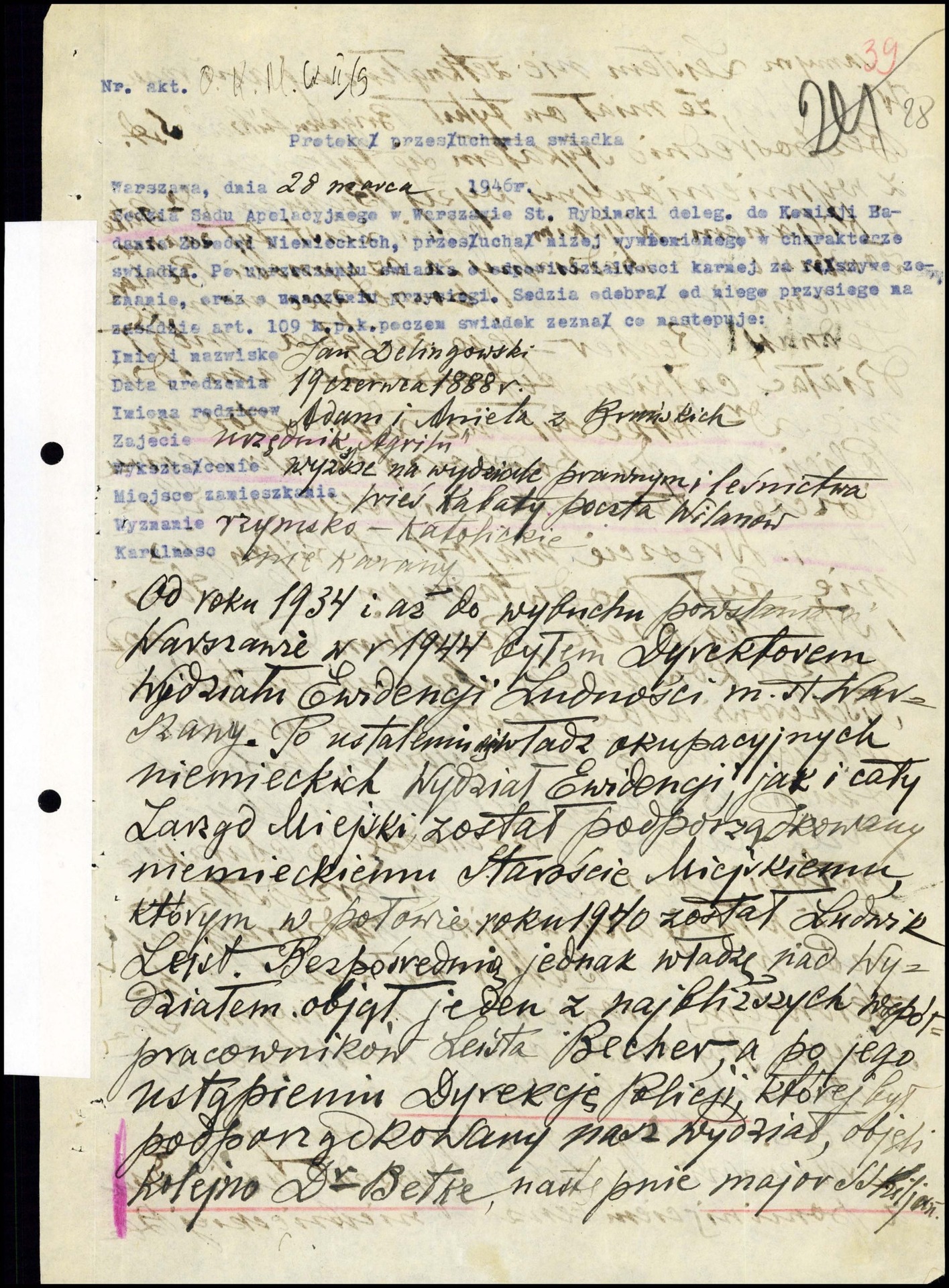 Przed kapitulacją Warszawy, pod koniec września 1939 roku, na polecenie Starzyńskiego, Delingowski opracował wzór nowych dowodów osobistych dla członków polskiej konspiracji. Początkowo przygotowano 500 dowodów tożsamości in blanco. Wydział Ewidencji Ludności wkrótce zaczął prowadzić produkcję fałszywych dokumentów na większą skalę. Z narażeniem życia, pod nadzorem okupanta, urzędnicy wydawali fikcyjne dokumenty na oficjalnych blankietach, a następnie na wprowadzonych w 1942 roku „kenkartach”. W meldunkach i dowodach tożsamości usuwano także adnotacje dotyczące służby wojskowej oficerów czynnych w czasie działań wojennych i będących w rezerwie.