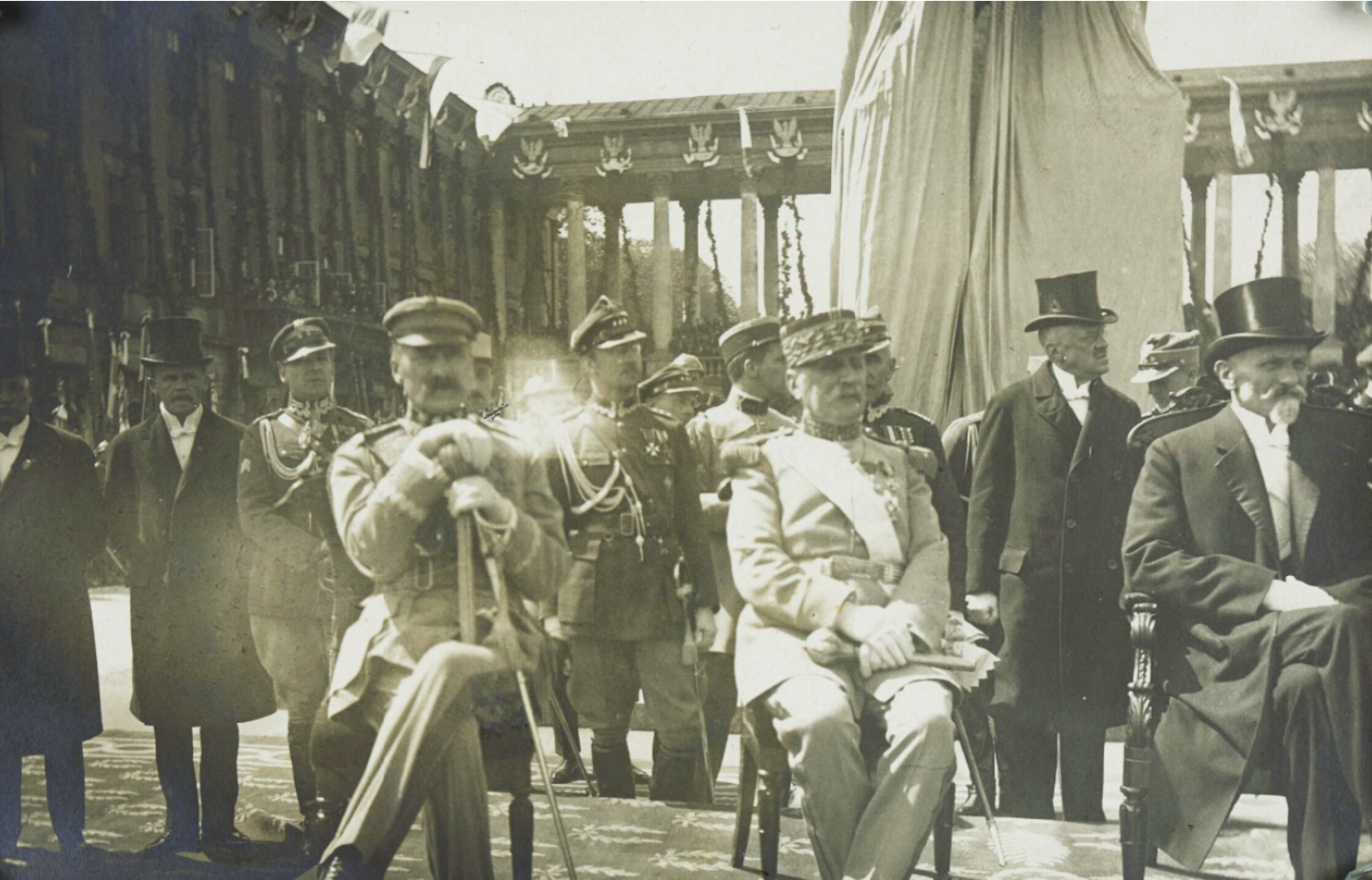 Uroczystość odsłonięcia pomnika księcia Józefa Poniatowskiego przed Pałacem Saskim w Warszawie połączona z nadaniem Ferdynandowi Fochowi tytułu marszałka Polski. Na miejscach siedzących: (od lewej) Józef Piłsudski, Ferdynand Foch i Prezydent RP Stanisław Wojciechowski, 3 maja 1923 r. Fot. z zasobu Biblioteki Narodowej