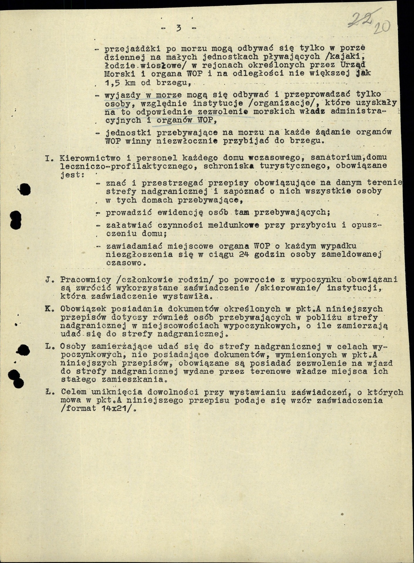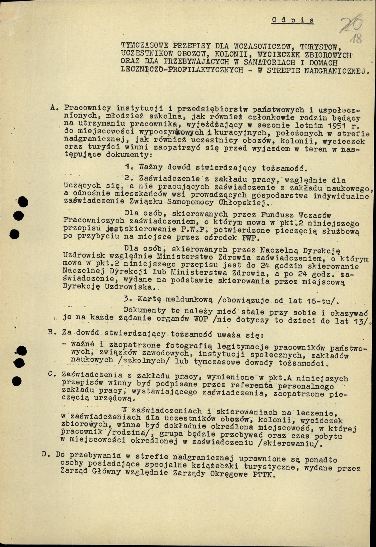Tymczasowe przepisy dla wczasowiczów, turystów, uczestników obozów, kolonii, wycieczek zbiorowych oraz dla przebywających w sanatoriach i domach leczniczo-profilaktycznych w strefie nadgranicznej, wydane przez Prezydium Rady Ministrów 16 VI 1951 r. (z zasobu IPN)