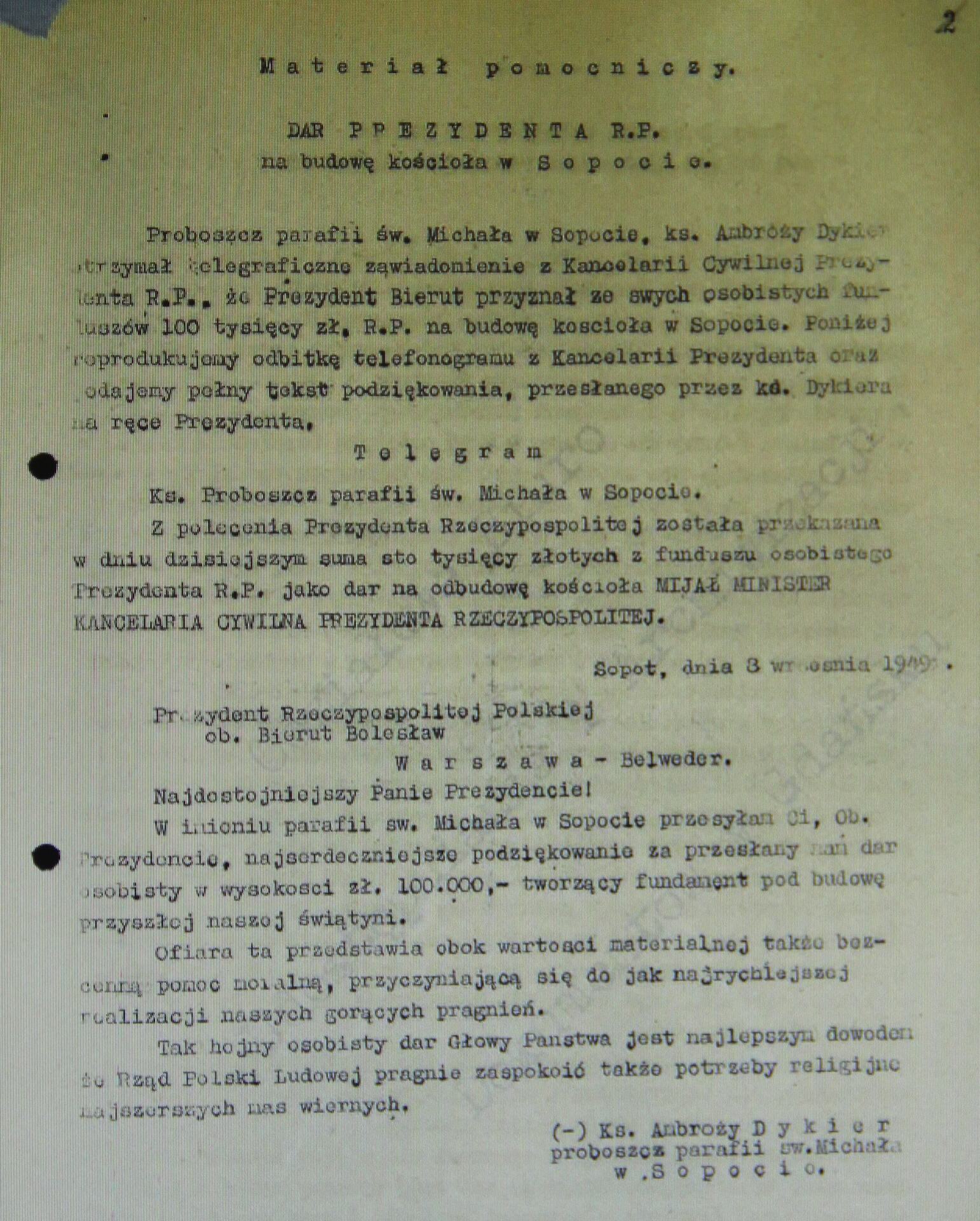 Niedługo później, we wrześniu 1949 r. – zgodnie z wcześniejszą deklaracją ‒ prominentny ksiądz „patriota” otrzymał na budowę sopockiej świątyni „dar” od Bieruta w kwocie 100 tys. zł, które prezydent