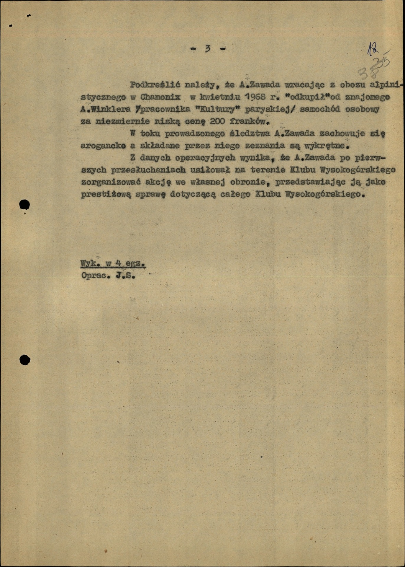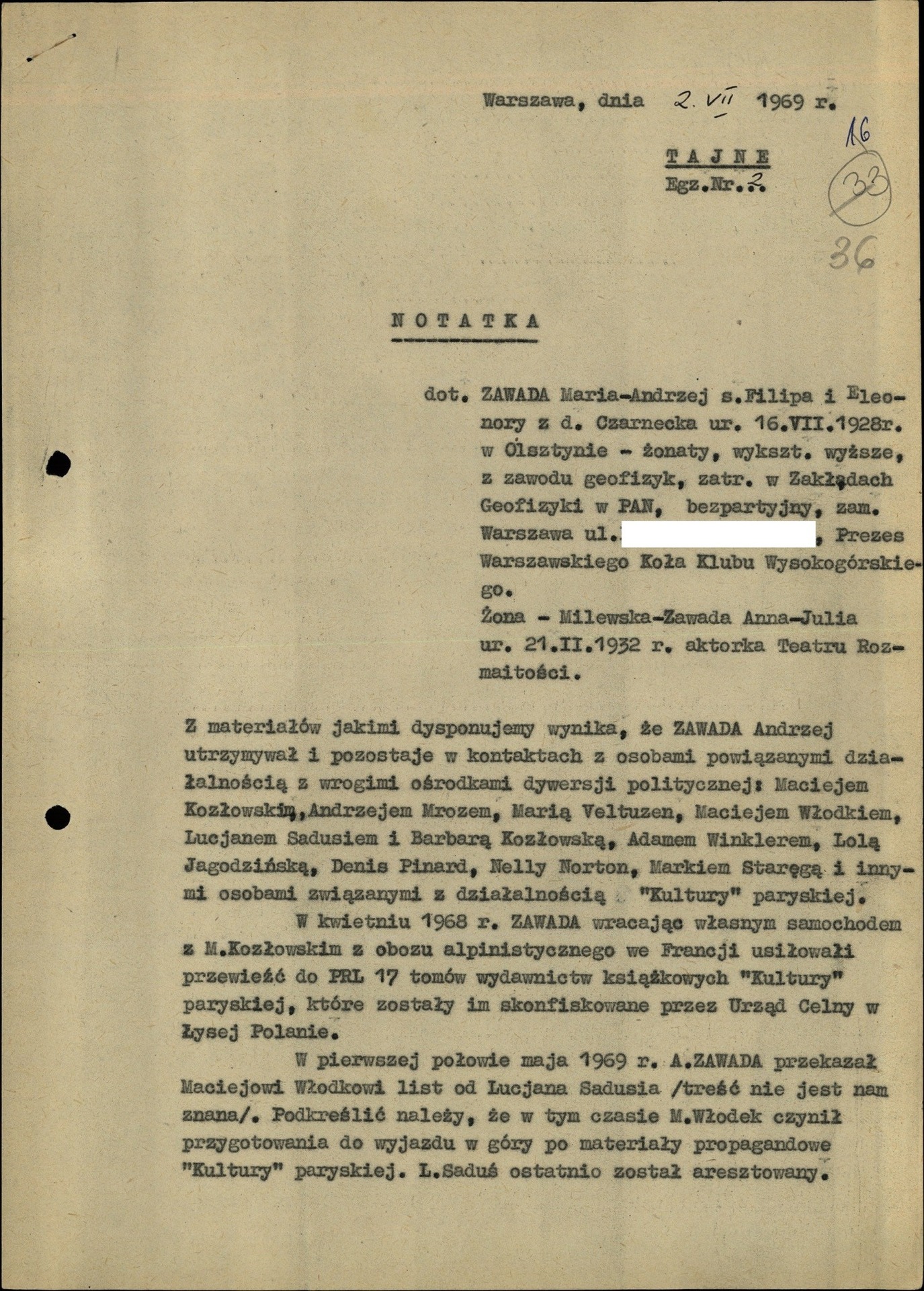 „Przyszli do nas dokładnie o godzinie dwudziestej trzydzieści 12 czerwca [1969 r.] – opowiada Anna Milewska, żona Andrzeja Zawady, o wizycie SB. Pięciu smutnych panów. Andrzej nie wrócił jeszcze z czwartkowego spotkania w Klubie Wysokogórskim […]. Czytali listy, pisma, szukali wszystkiego, na czym było napisane »pieniądze«, zabrali całą korespondencję obcojęzyczną. Mieli nadzieję, że znajdą informację o zagranicznym finansowaniu polskiej działalności opozycyjnej – wspomina Anna”1.