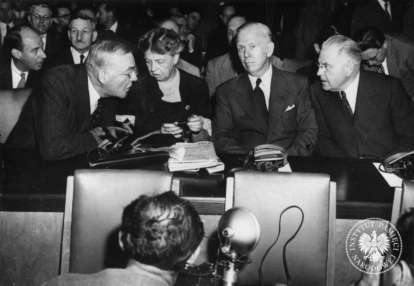 Członkowie delegacji amerykańskiej na posiedzeniu Zgromadzenia Ogólnego ONZ podczas wystąpienia przedstawiciela władz ZSRS Andrieja Wyszynskiego. W pierwszym rzędzie, drugi od prawej, sekretarz stanu USA George C. Marshall, obok niego przewodnicząca Komisji Praw Człowieka ONZ Eleanor Roosevelt (wdowa po prezydencie Franklinie D. Roosevelcie).20–21 I 1947 r. Fot. z zasobu IPN