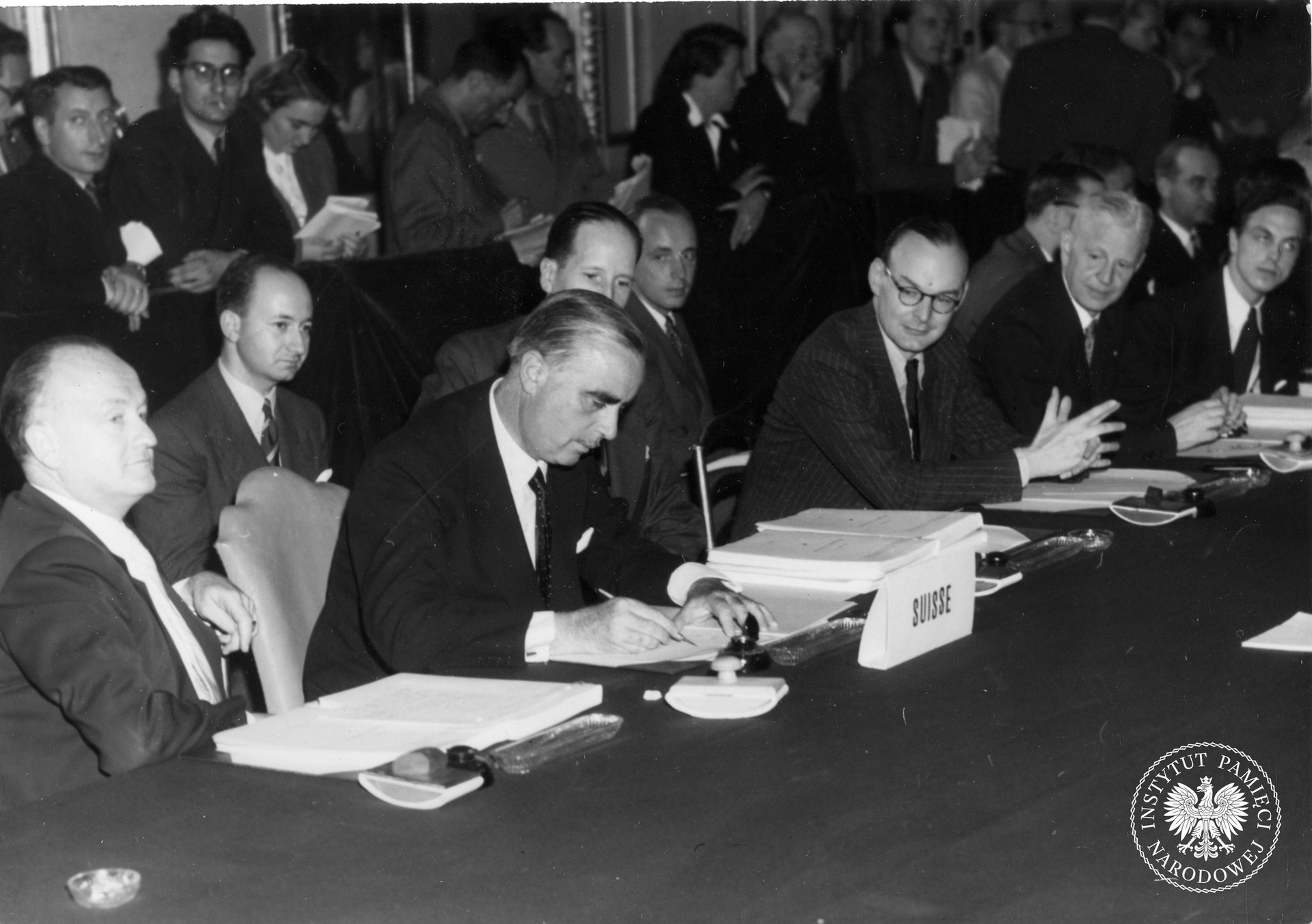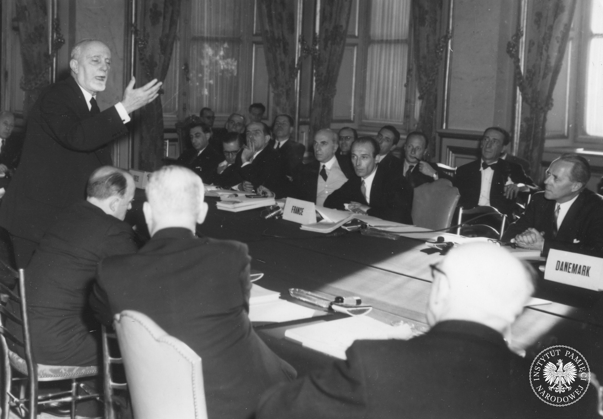 Konferencja 16 państw europejskich w Paryżu. Na zdjęciu Carlo hr. Sforza, minister spraw zagranicznych Włoch, przemawiający podczas zakończenia obrad. Po przeciwnej stronie stołu delegacje (od prawej) Danii, Francji i Grecji. 12 VIl 1947 r. Fot. z zasobu IPN