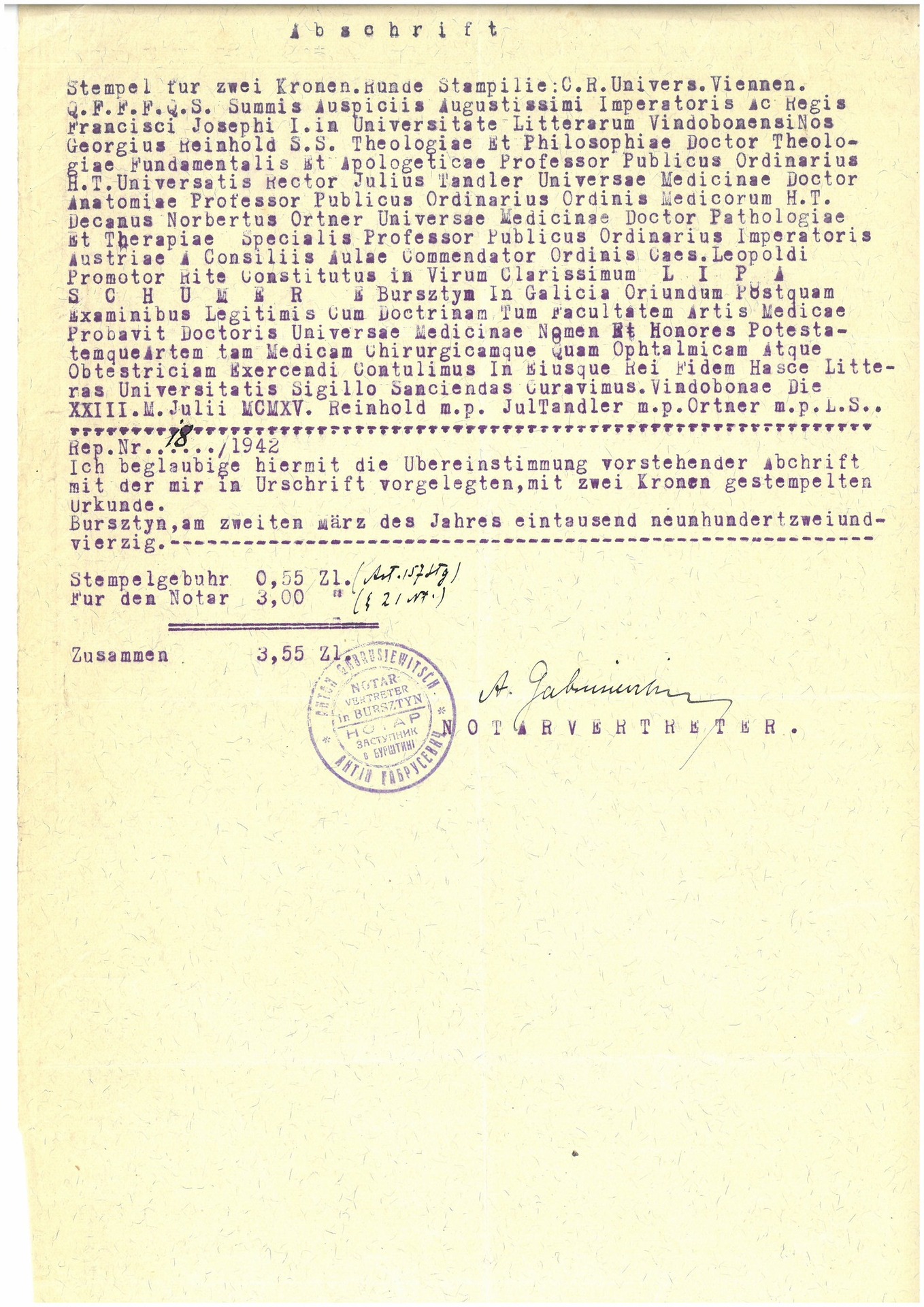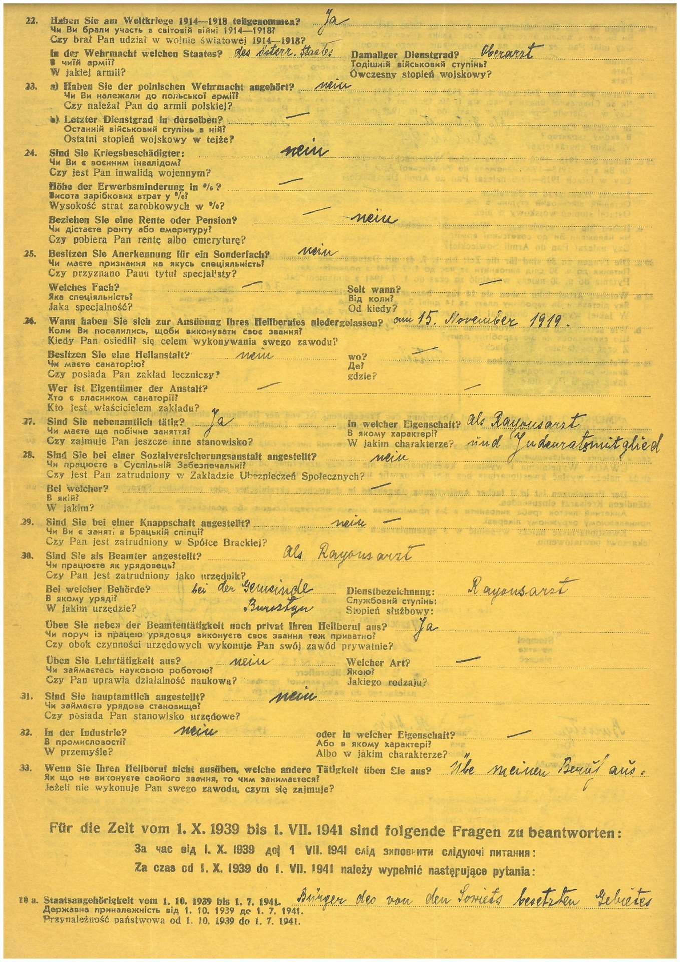 Kwestionariusz dla pierwszego zgłoszenia zawodów leczniczych dotyczący Lipy Schumera. Bursztyn, 11 III 1942 r. (z zasobu IPN)