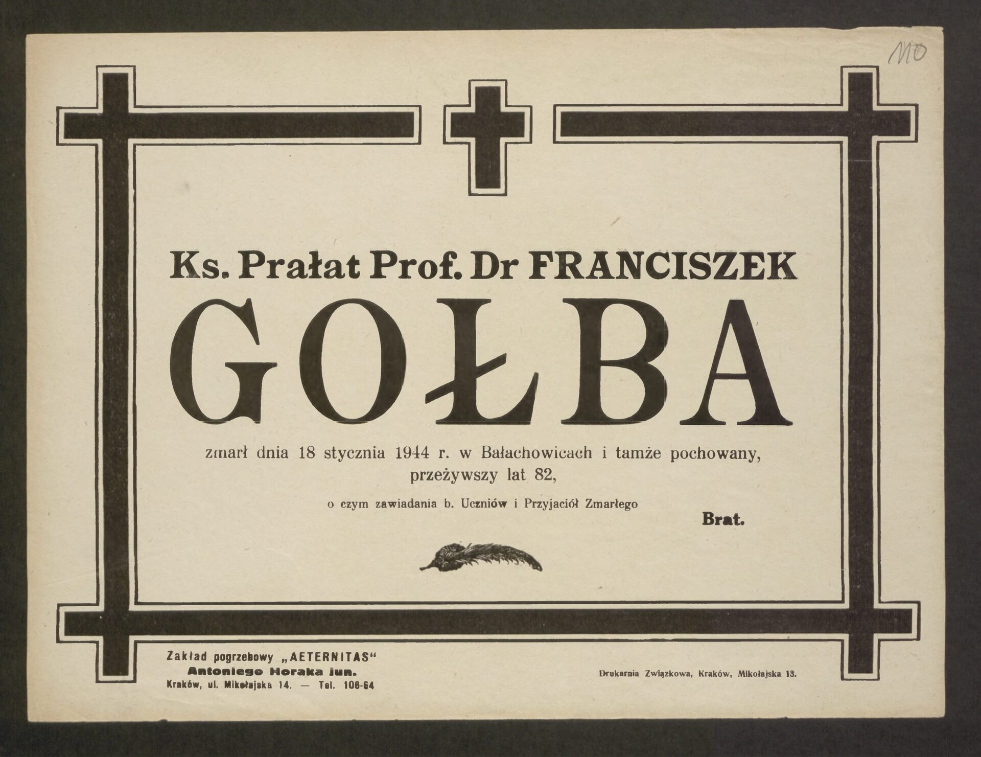 Ksiądz Franciszek Gołba – założyciel licznych instytucji i organizacji, zaangażowany w działalność religijno-wychowawczą, oświatową, gospodarczą, charytatywną, budowniczą, publicystyczną – zmarł w Bachowicach, rodzinnej wiosce położonej niedaleko Wadowic. Został pochowany na cmentarzu obok świątyni wzniesionej dzięki jego staraniom i pracy pełnej poświęcenia. Ojciec Rudolf Warzecha – karmelita, rodak i wychowanek ks. Gołby, dziś kandydat na ołtarze, wspominał: