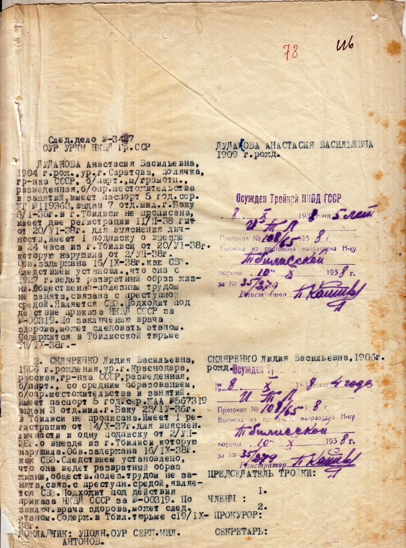Anastazji Dudakowej zarzucono rozwiązły tryb życia, uchylanie się od pracy oraz związki ze światem przestępczym. Skazano ją na 5 lat łagrów.