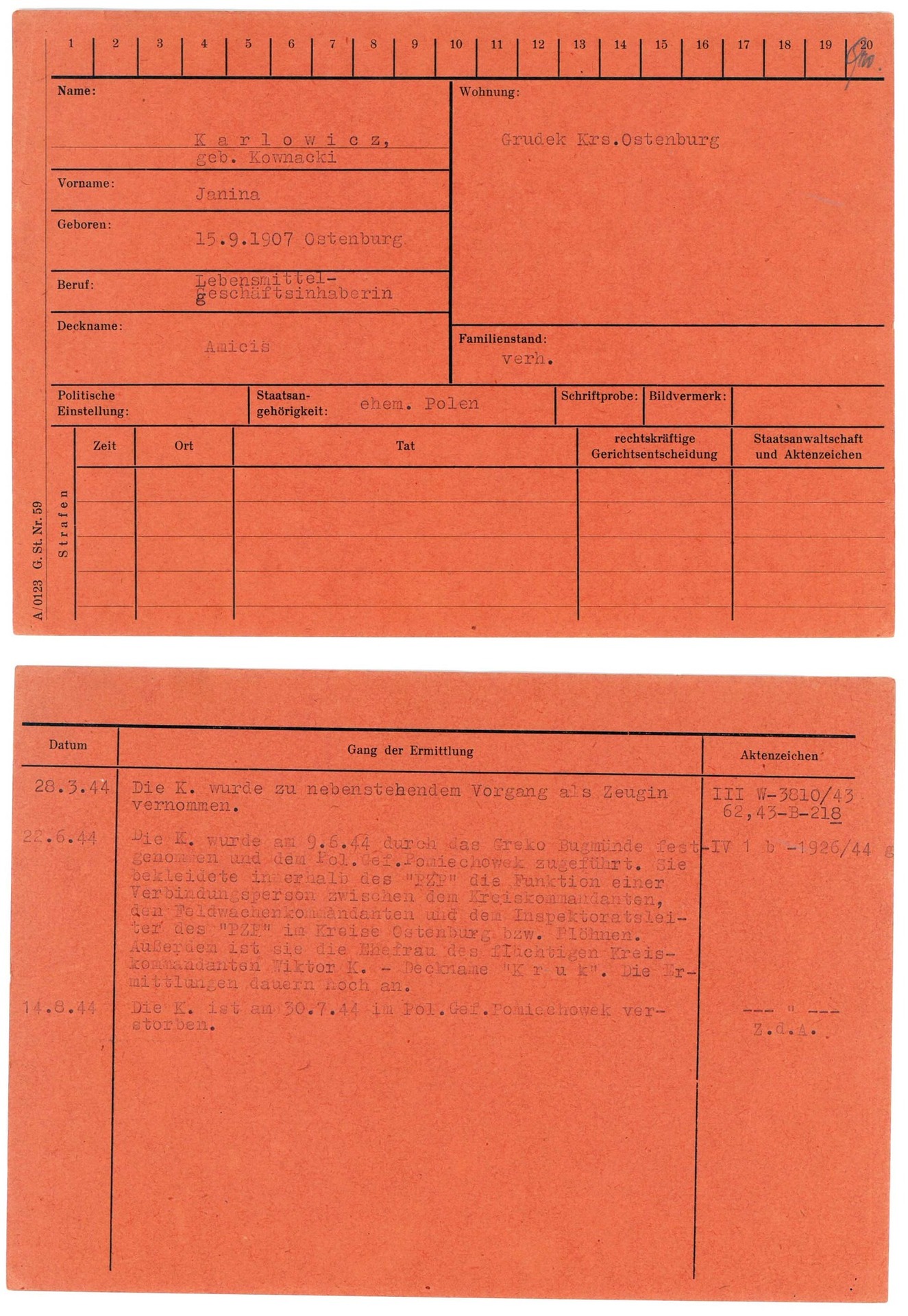 Janina Karłowicz z d. Kownacka (1907-1944), ps. Amicis, łączniczka AK placówki w Pułtusku, wraz z mężem, Wiktorem Karłowiczem ps. Kruk, działała w strukturach Obwodu Pułtusk AK. Na wiosnę 1944 r. nastąpiła dekonspiracja placówki. Janina postanowiła, że nie będzie się ukrywać, aby nie pozostawiać bez opieki dwójki młodszych dzieci. Została aresztowana 9 czerwca 1944 r. Zginęła 30 lipca 1944 r. w Forcie III. Jej ciało zostało ekshumowane w 1948 r. i pochowane w zbiorowej mogile na cmentarzu w Pomiechowie.