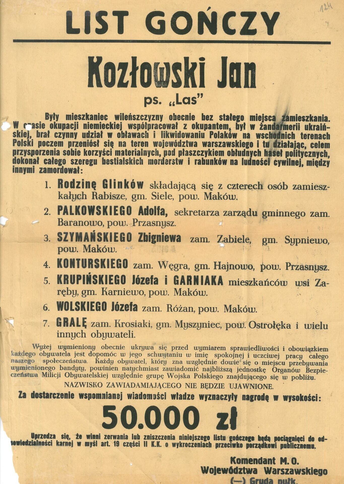 Pismo płk. dr. Władysława Garnowskiego, prezesa Najwyższego Sądu Wojskowego, do szefa Wojskowego Sądu Rejonowego w Warszawie, informujące, „że Prezydent R.P. decyzją Swą z dnia 5 VIII 1949 r. nie skorzystał z prawa łaski w stosunku do skazanych: KOZŁOWSKIEGO Józefa, syna Michała, MACUKA Piotra, s. Jana, SZYSZKO Bolesława, s. Konstantego i KANI Czesława, s. Leopolda (…)”. Warszawa, 8 VIII 1949 r. (z zasobu IPN)