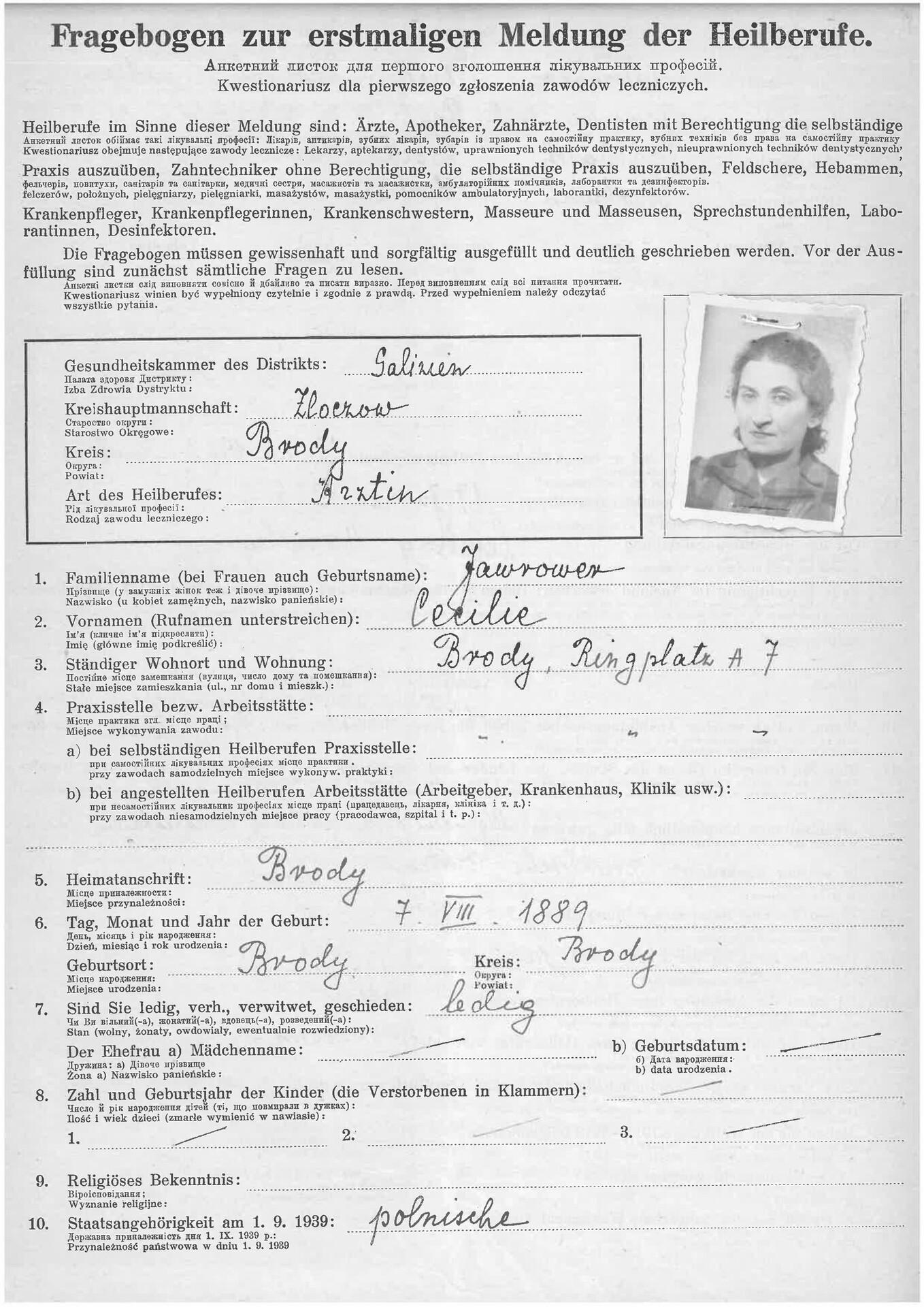 Kwestionariusz dla pierwszego zgłoszenia zawodów leczniczych dotyczący Cecilie Jawrower. Brody, 17 XI 1941 r. (z zasobu IPN)