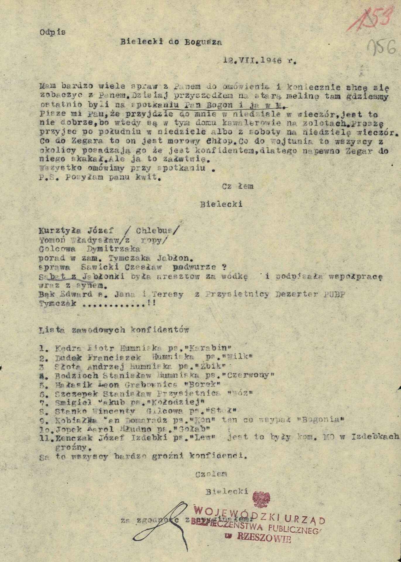 „za czasów okupacji niemieckiej należał do organizacji AK. Po wyzwoleniu nie zaniechał on swojej działalności i dalej należał do organizacji WiN, w której pełnił funkcje szefa wywiadu na powiat Brzozów, werbując sieć informatorów w organach MO i UB, od której to sieci czerpał materiały wywiadowcze z terenu MO i UB, które to materiały przekazywał następnie swoim władzom zwierzchnim. Niezależnie od tego w 1946 r. brał udział w zamelinowaniu broni w kościele w Malinówce, która to broń była tam zachowana do 1949 r. W czasie amnestii ujawnił się, nie ujawniając jednak swojej działalności w organizacji WiN. Po amnestii dalej utrzymywał kontakty z członkami organizacji WiN, którzy do tego czasu ukrywają się”,
