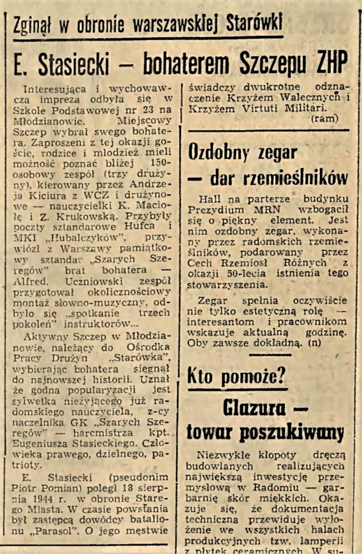 Śmierć Stasieckiego rozniosła się szerokim echem po całym kraju. Niestety nie udało się kolegom podjąć zwłok z placu boju. Pozostał tam, gdzie poległ. Dopiero w lutym 1945 r. przyjaciele odnaleźli go wśród ruin. Identyfikacja była możliwa po Krzyżu Harcerskim, który w godzinie „W” wręczył mu hm. Jan Rossman.