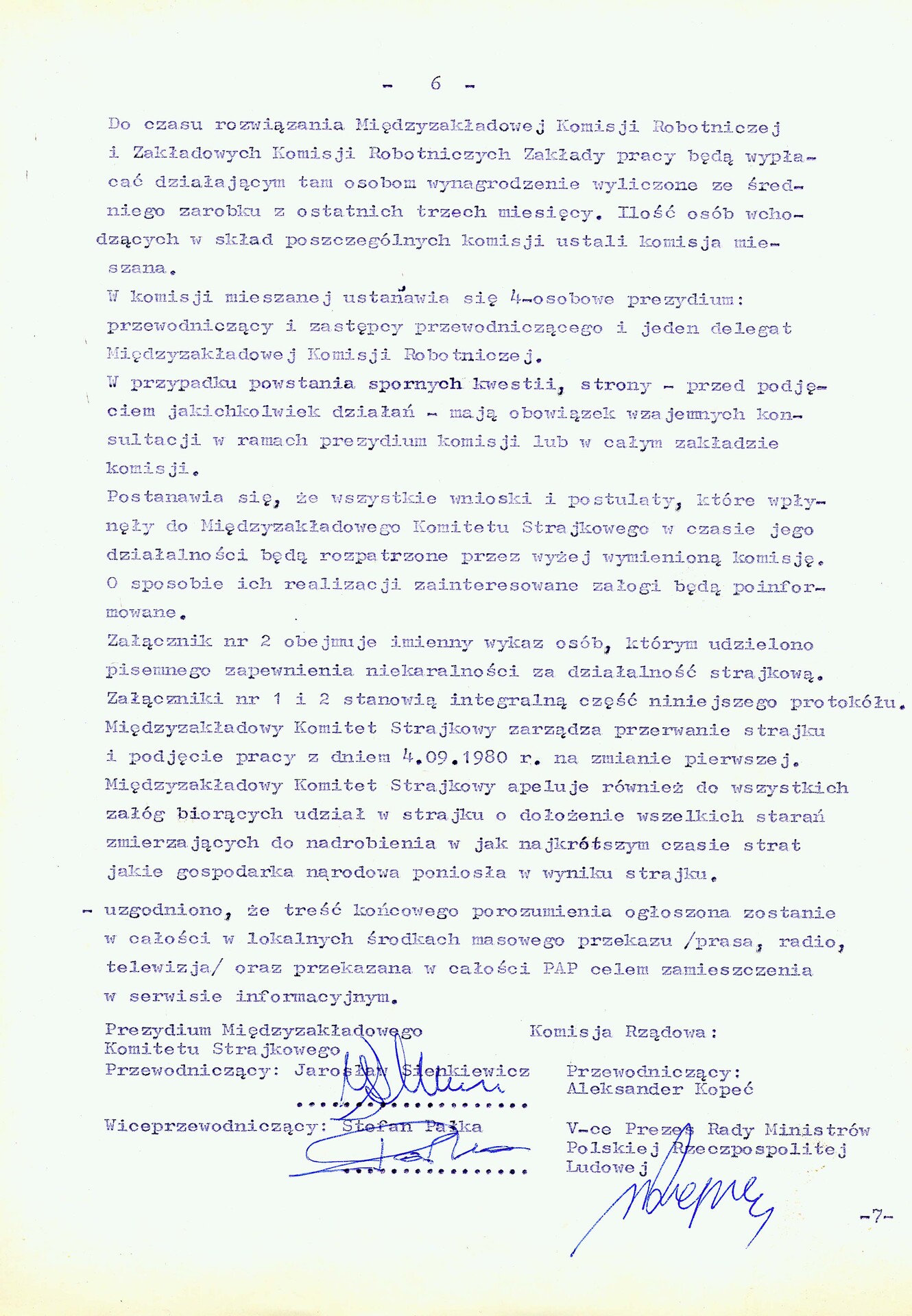 Była to nader optymistyczna wersja wydarzeń, gdyż negocjacje, które rozpoczęły się w cechowni „Manifestu Lipcowego” zgodnie z ustaleniami 2 września 1980 r. o godz. 17.00 miały jednak swoją dramaturgię i dynamikę. Zakończono je krótko przed północą, po czym ogłoszono kilkugodzinną przerwę, która potrzebna była po to, aby zredagować i przepisać końcowe dokumenty. Uroczyste podpisanie porozumienia, zwanego odtąd jastrzębskim, nastąpiło 3 września około godziny 5.40. Strony uzgodniły, że treść końcowego porozumienia zostanie w całości ogłoszona w lokalnych środkach przekazu oraz przekazana w całości Polskiej Agencji Prasowej, która miała zamieścić tekst w swoim serwisie informacyjnym. Rzeczywiście, komunikat taki „Trybuna Robotnicza” podała 4 września publikując także, zgodnie z postanowieniami porozumienia jastrzębskiego, tekst tego dokumentu. Przesilenie 1980 r. wchodziło w nową fazę.