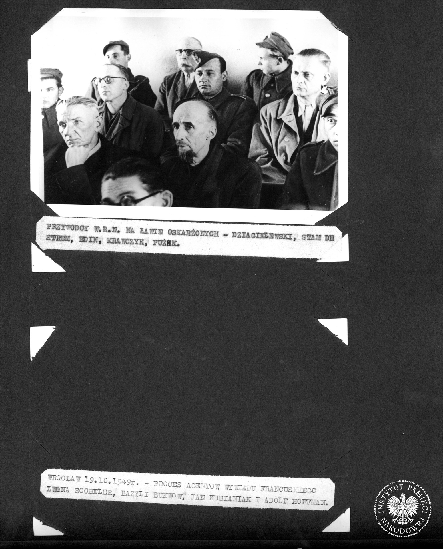 Strona nr 34 z albumu pt. „Z historii walk funkcjonariuszy UB, MO i żołnierzy KBW z wrogim podziemiem” (fotokopia). Strona wybrakowana – zawiera jedną fotografię. Pod nią znajduje się podpis: „Przywódcy WRN na ławie oskarżonych – Dziagielewski [właśc. Dzięgielewski], Stam de Strem [właśc. Szturm de Sztrem], Edin [właśc. Cohn], Krawczyk, Pużak” Fot. z zasobu IPN