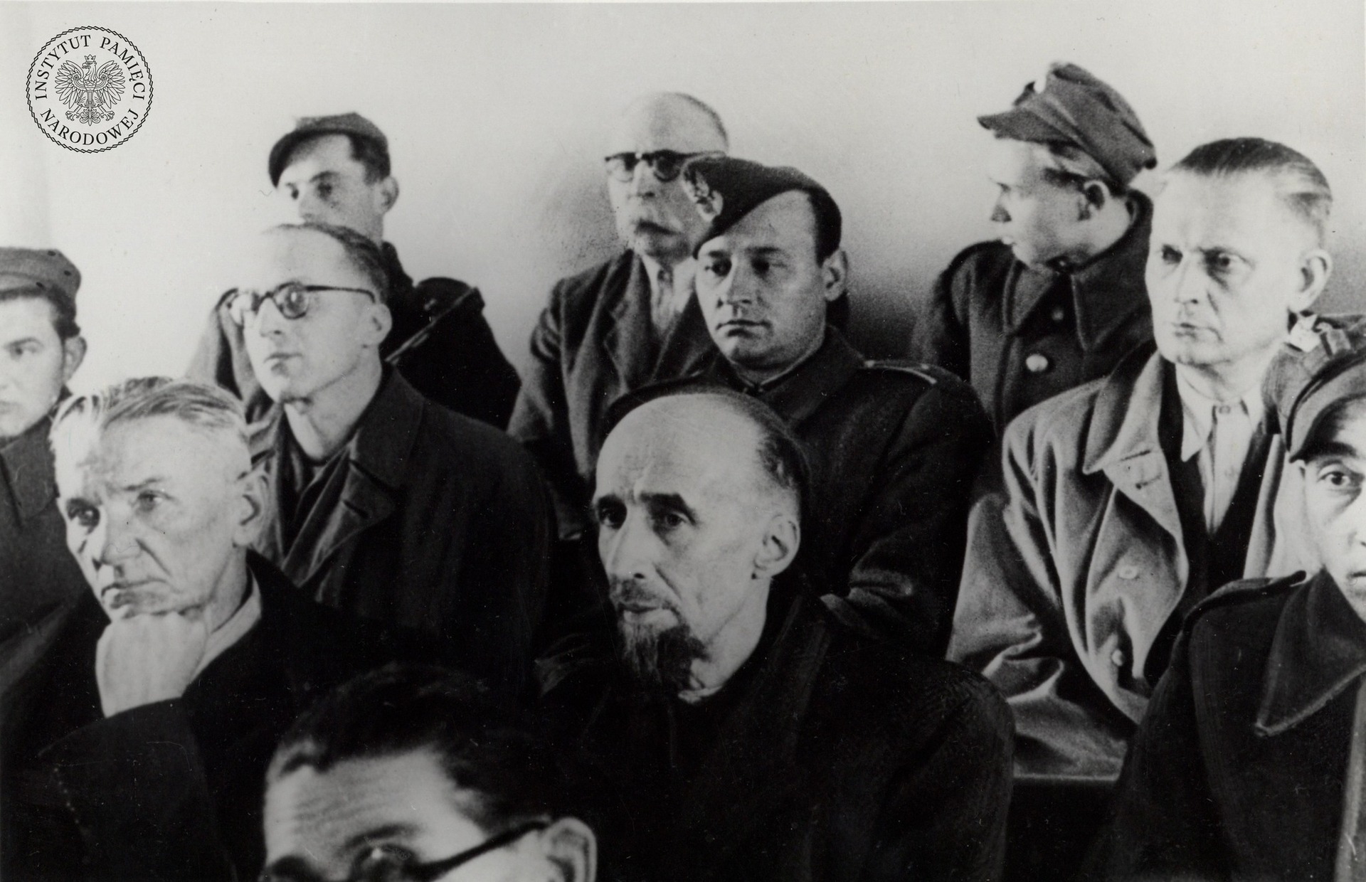 Oskarżeni w procesie pokazowym przywódcy PPS-WRN wśród strażników – zdjęcie z albumu. Widoczni na zdjęciu, od lewej: w pierwszym rzędzie – Józef Dzięgielewski (podpierający twarz dłonią) i Tadeusz Szturm de Sztrem, w drugim rzędzie – Ludwik Cohn (w okularach) i Wiktor Krawczyk, w ostatnim rzędzie – Kazimierz Pużak. Fot. z zasobu IPN