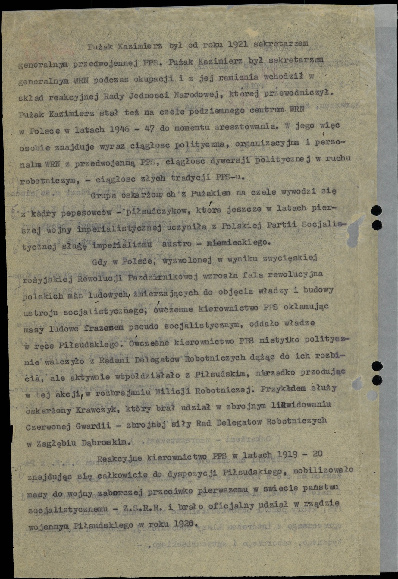 W Archiwum IPN wśród materiałów dotyczących Kazimierza Pużaka znajduje się m.in. obszerny zbiór akt ze wspomnianego procesu przywódców PPS-WRN. Akt oskarżenia jest obszerną wykładnią stosunku nowych władz do przeciwników politycznych z PPS, oskarżanych o
