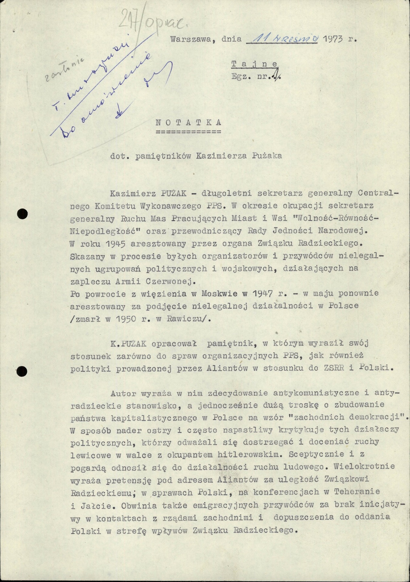 Postać Kazimierza Pużaka nie przestała niepokoić władz komunistycznych nawet po śmierci. W zbiorach Archiwum IPN zachowała się notatka płk. K. Sławińskiego z Departamentu III MSW dotycząca znalezionego maszynopisu wspomnień Kazimierza Pużaka. Praca tego nieprzejednanego antykomunisty, powielana w podziemiu, z punktu widzenia aparatu rządzącego była wysoce szkodliwa. W podsumowaniu jest mowa o podjęciu kroków zmierzających do „ustalenia inicjatorów kolportażu i przejęcia materiałów”.