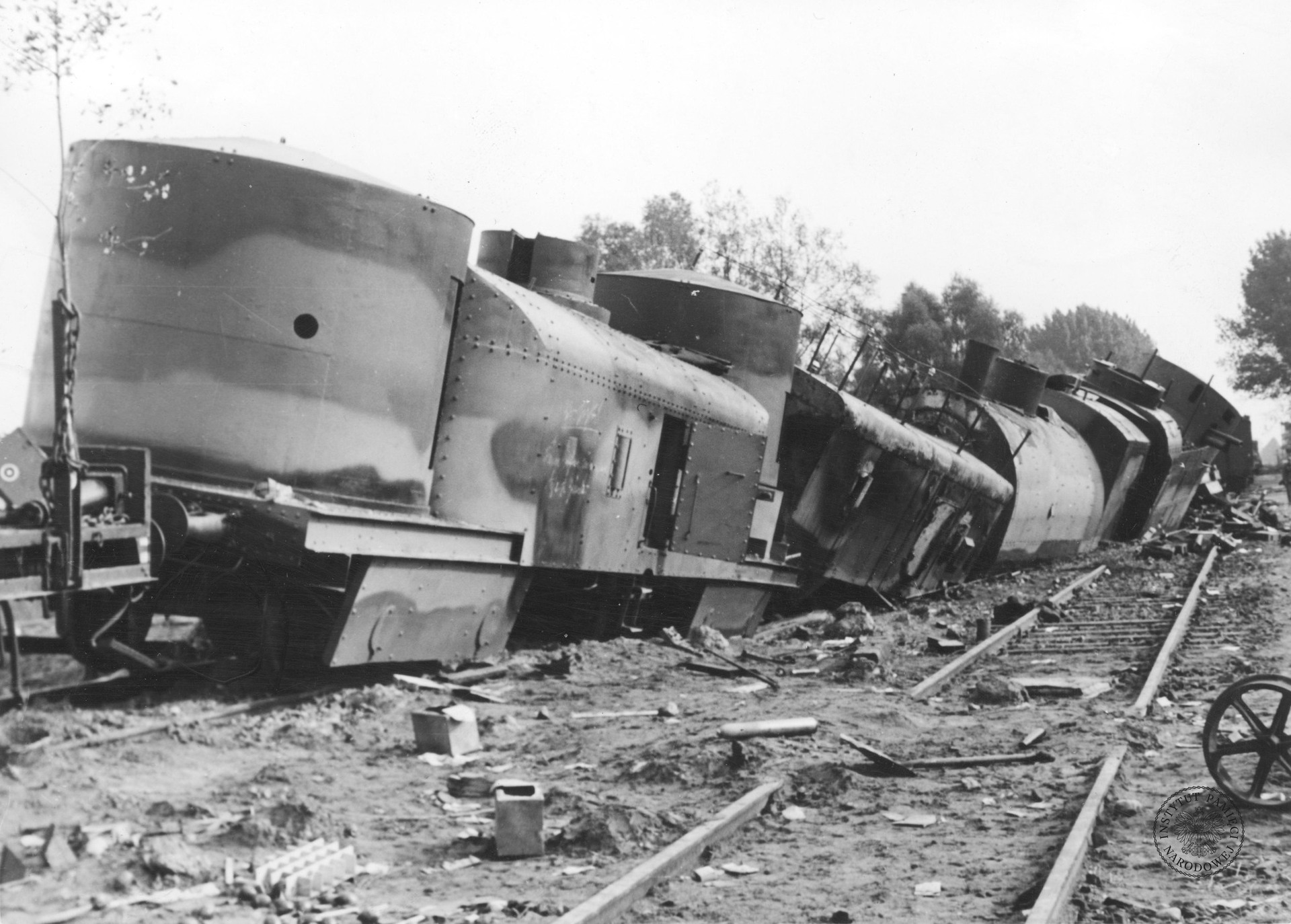 Wykolejony pociąg pancerny nr 13 „Generał Sosnkowski”. Na pierwszym planie po lewej węglarka lokomotywy, dalej obrotowa wieża działa wagonu artyleryjskiego. Autor: Dahms (Propaganda-Kompanie). Zdjęcie pochodzi ze zbioru kopii cyfrowych fotografii dokumentujących wydarzenia II wojny światowej, pozyskanego z Narodowej Agencji Archiwów i Nagrań w College Park, Maryland, USA (fot. z zasobu IPN)