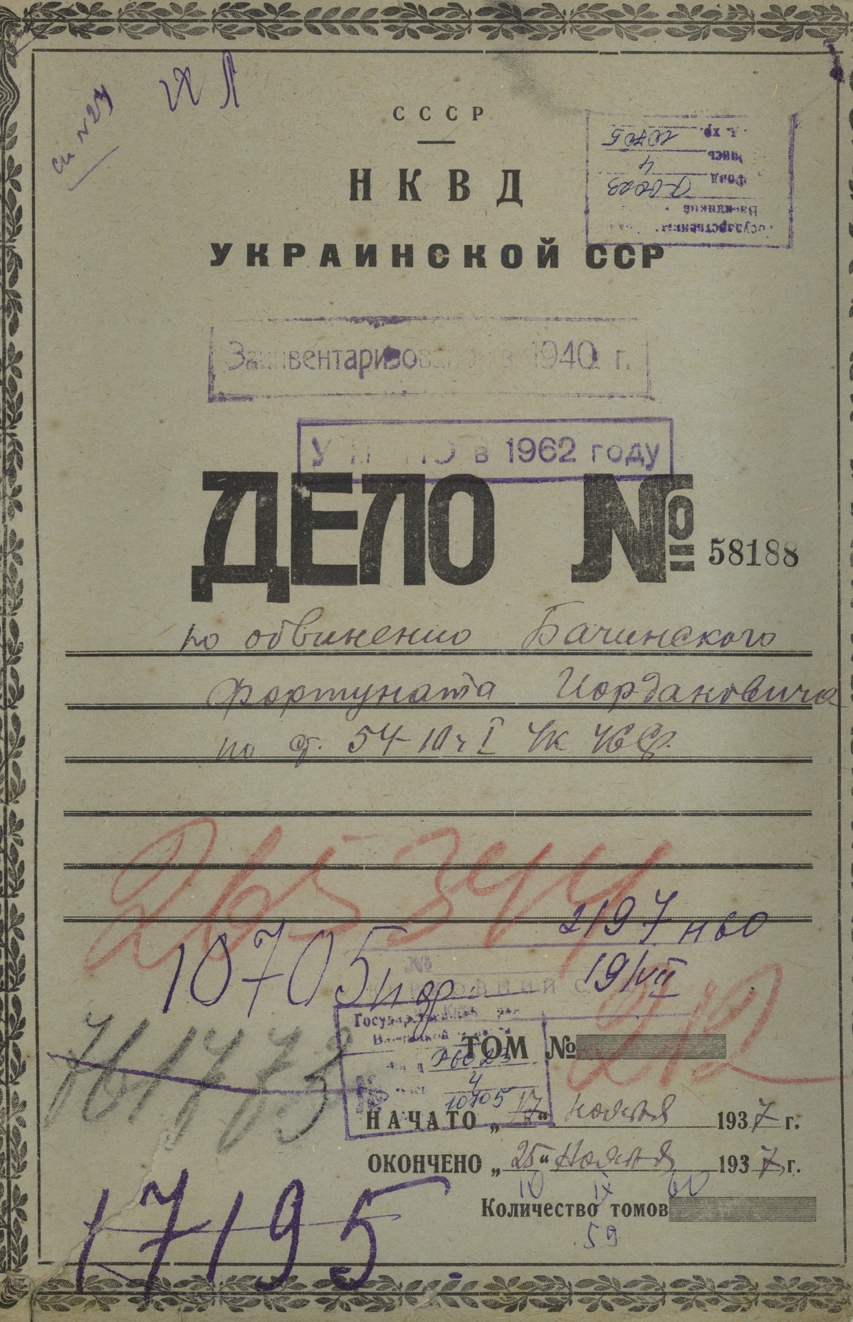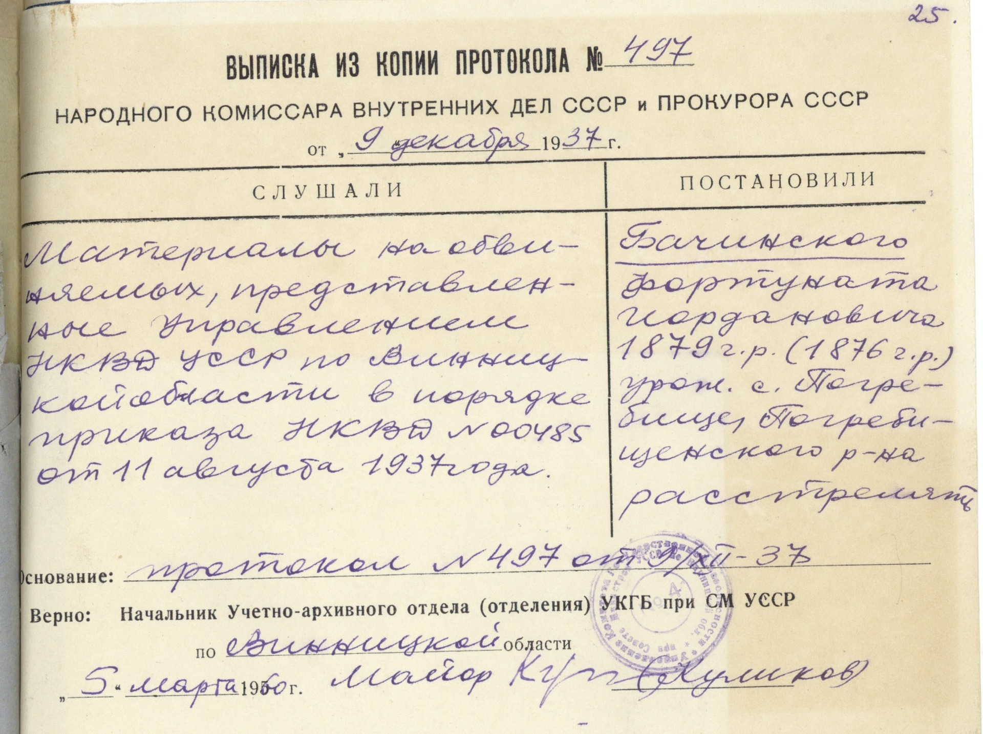 Jedną z ofiar „operacji polskiej” był Fortunat Baczyński, s. Jordana (akta śledcze z zasobu Archiwum Obwodowego w Winnicy, Ukraina). Urodził się w 1879 r. we wsi Pohrebyszcze nieopodal miasta Winnica. Miał żonę i czworo dzieci: synów Edwarda, Leonida i Kazimierza oraz córkę Janinę. Pracował jako wartownik w zakładzie cukrowniczym. Został aresztowany 17 listopada 1937 r. pod zarzutem „antysowieckiej agitacji” wymierzonej w działania partii i rządu, rozprzestrzenianie plotek o rychłym zagarnięciu Ukrainy przez Polaków i upadku władz sowieckich. Miał wówczas 58 lat.