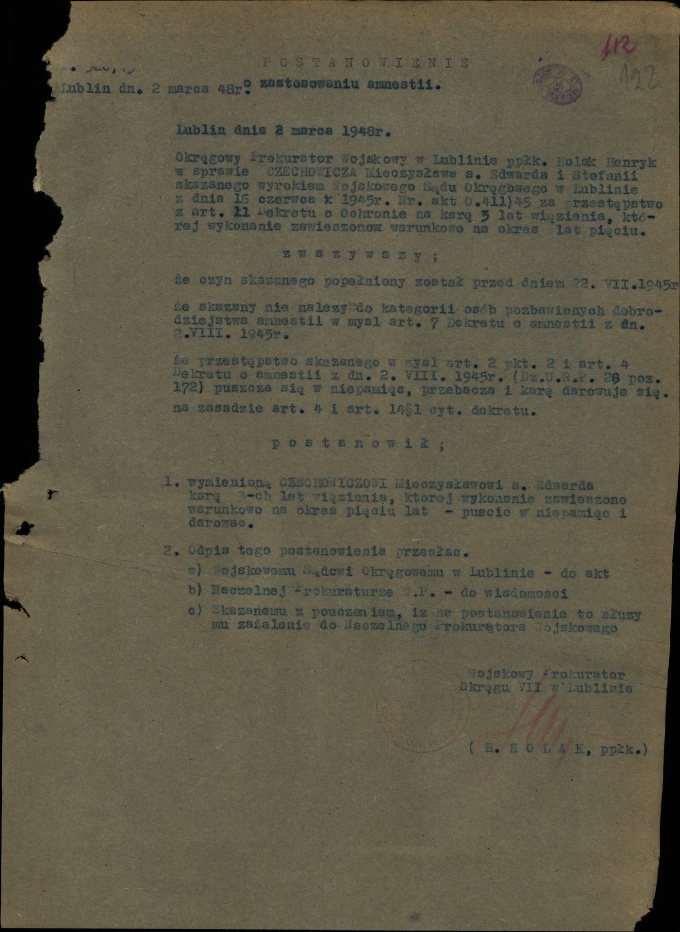 Sądzony był wraz z innymi osobami związanymi z konspiracją lubelską, m.in. Kazimierzem Szajnochą oraz Jerzym Pelczarskim. W akcie oskarżenia zarzucono Czechowiczowi, że wiedząc o ich działalności w AK „zaniechał o tym donieść w porę Władzy”. 16 czerwca 1945 r. wyrokiem Sądu Wojskowego Okręgu Lubelskiego 15-letni Mieczysław został skazany na trzy lata więzienia z warunkowym zawieszeniem orzeczonej kary na „przeciąg lat 5”.
