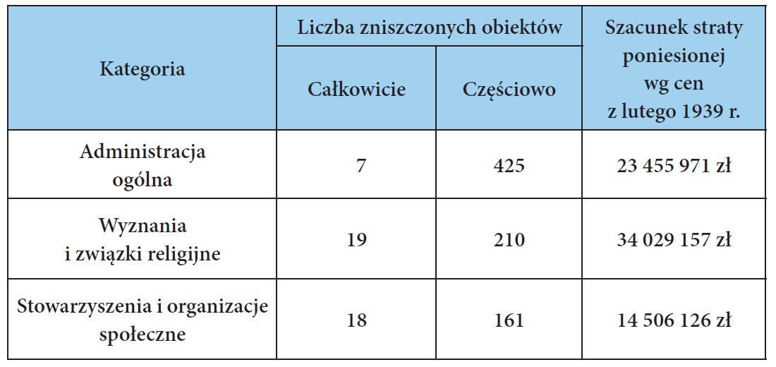 W tabelach 1 i 2 przedstawiono wykazy ukazujące: (1) szkody wojenne w mieniu państwowym, związków religijnych oraz stowarzyszeń i organizacji społecznych województwa pomorskiego, a także (2) stopień zniszczenia budynków szkolnictwa podstawowego w województwie pomorskim.