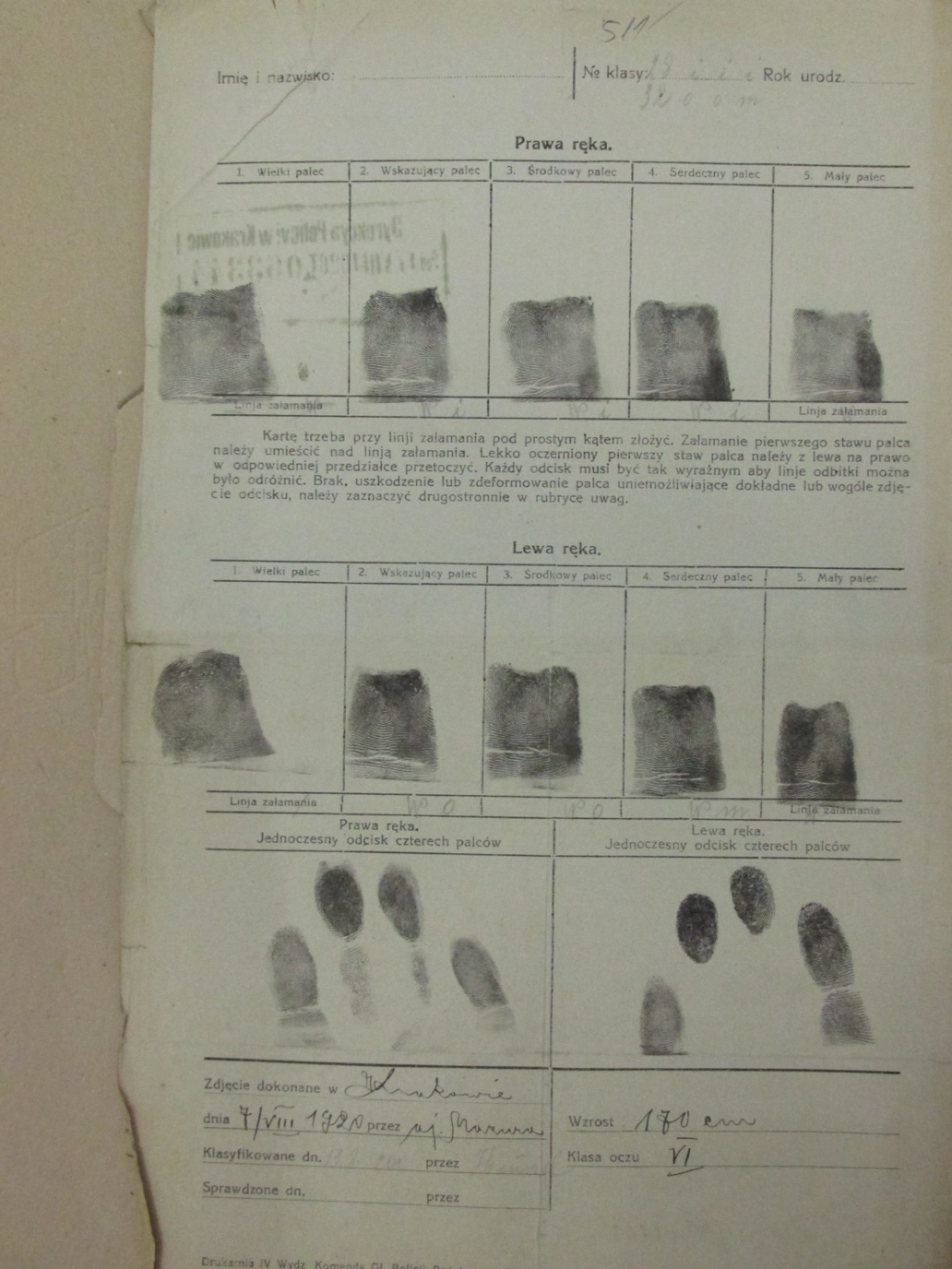 Jeszcze innym ciekawym wątkiem jest sprawa włamania do Muzeum Czapskich w 1921 r. Nie wiadomo kim byli włamywacze i gdzie można było ich szukać. Natomiast, jak się okazało, poszukiwani pozostawili po sobie ślady krwi i odciski palców na kawałkach stłuczonej szyby. Funkcjonariusze wydziału śledczego sfotografowali te ślady i zdjęcia przesłali do Komendy Głównej, w której mieściło się laboratorium daktyloskopijne. Wyniki zidentyfikowały jednego sprawcę, a drugi pozostał anonimowy6.
