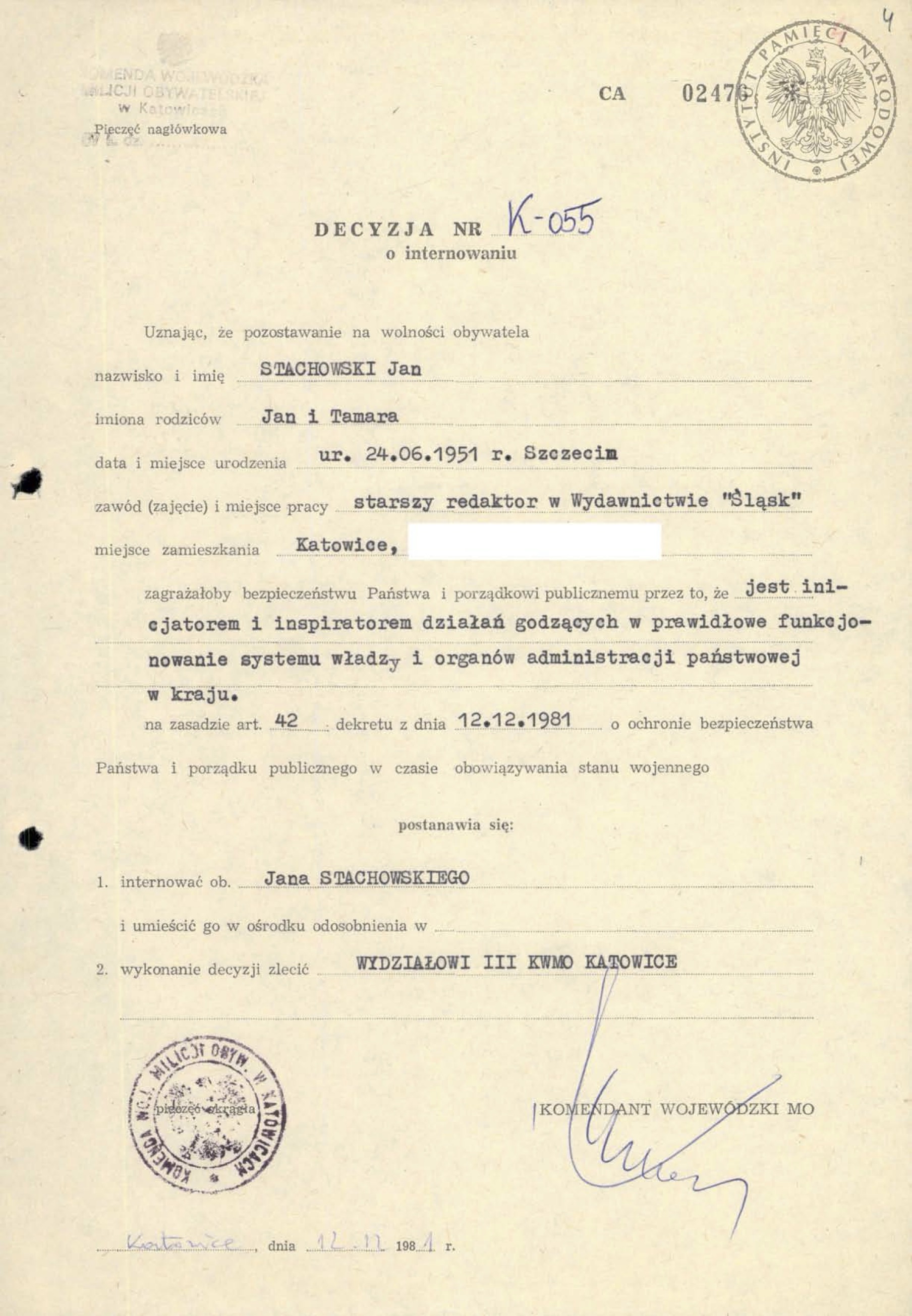 Po wprowadzeniu stanu wojennego Stachowski został internowany i osadzony w areszcie w Katowicach, przeciwko czemu złożył pisemny protest. 24 grudnia 1981 r., po podpisaniu dokumentu o wstrzymaniu się od wrogiej działalności, zwolniono go i wrócił do pracy. Jednak nie przywrócono go na dawne stanowisko – trafił do mniej istotnego działu młodzieżowego, co było oczywiście złośliwością dyrekcji oficyny. Także SB uprzykrzała mu pracę – przeprowadzano z nim rozmowy „profilaktyczno-ostrzegawcze”, szczególnie przed 1 maja, grożąc konsekwencjami za podejmowanie antypaństwowych demonstracji. Stachowski podkreślał zawsze, że nie zamierza uczestniczyć w pochodzie pierwszomajowym ani demonstrować lojalności wobec władz, które go internowały.