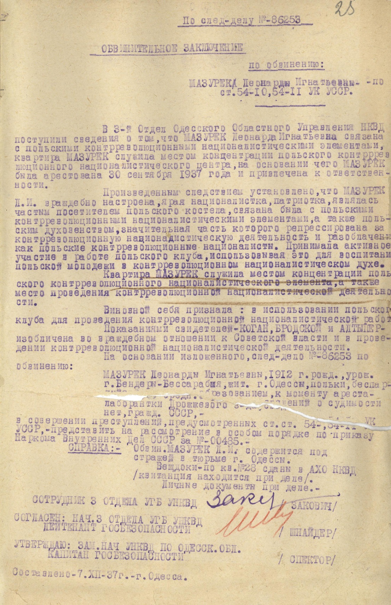 Leonarda Mazurek urodziła się w 1912 r., mieszkała w Odessie, miała średnie wykształcenie, pracowała jako laborantka w zakładach drożdżarskich. 30 września 1937 r. została aresztowana w związku z podejrzeniem o uczestnictwo w „polsko-nacjonalistycznej grupie młodzieży” i „antysowiecką agitację”. Z akt śledczych nie wynika, skąd enkawudziści powzięli podejrzenie o jej rzekomo kontrrewolucyjnej działalności, jednak jej nazwisko mogło paść podczas zeznań innych aresztowanych lub po prostu ogólnej obserwacji środowiska polskiego, które było „niepewne” en masse.