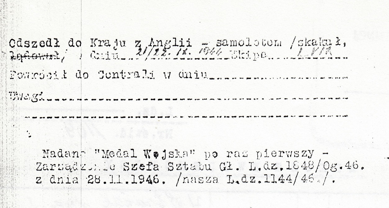 W nocy z 21 na 22 września 1944 r., po wykonaniu skoku spadochronowego, wylądował w rejonie wsi Czaryż, około 20 km od Włoszczowy.