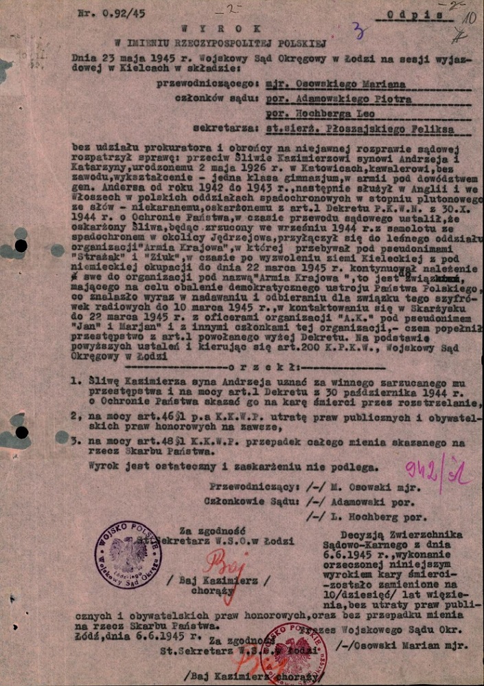 Kazimierz Śliwa został zwolniony z więzienia w Rawiczu 1 czerwca 1948 r. na skutek ułaskawienia przez Bolesława Bieruta.