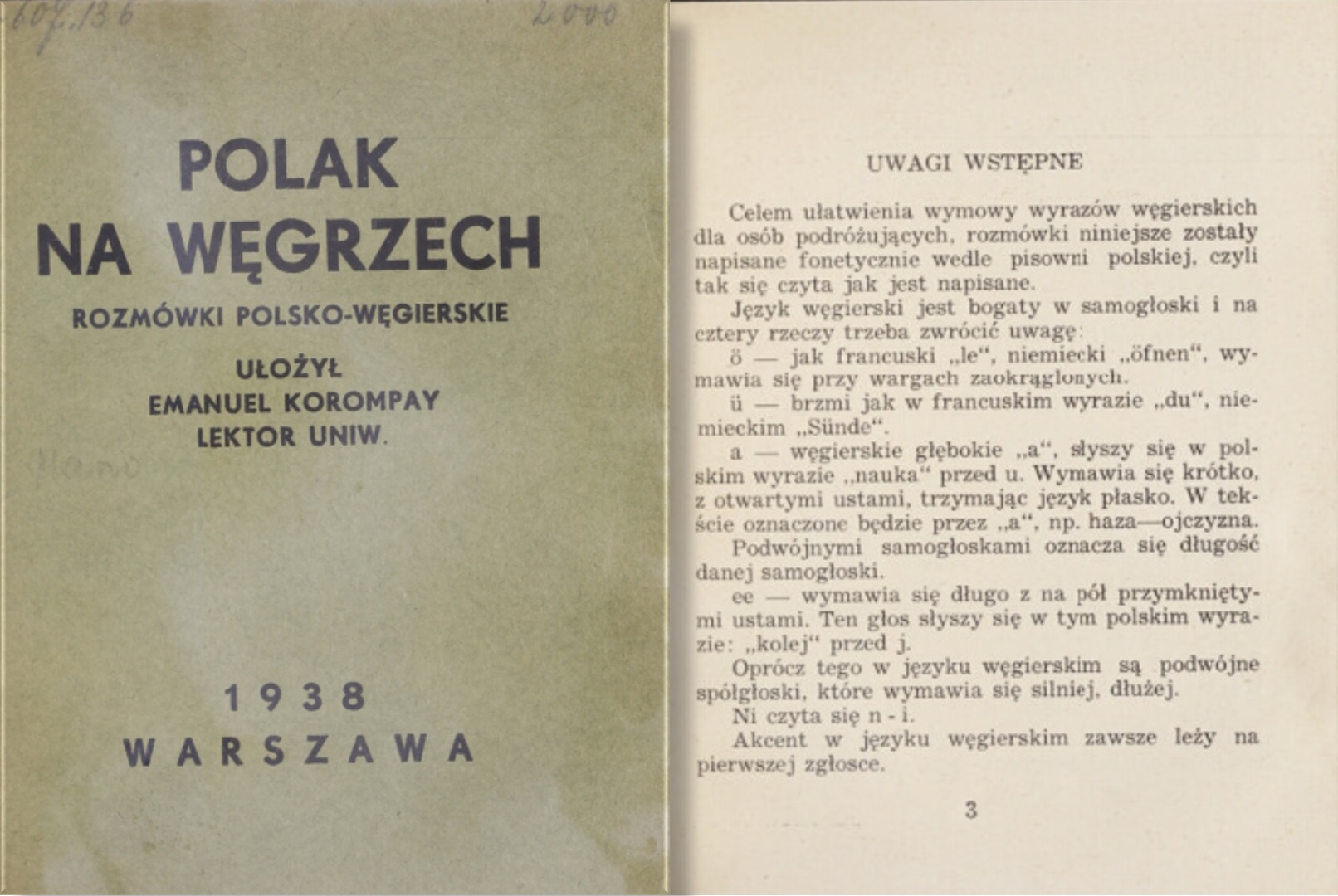 3 M. Korompay, Polak na Węgrzech. Rozmówki polsko-węgierskie, Warszawa 1938, https://polona.pl/preview/138d2480-e3d9-4b65-91e1-39457a86d3ba