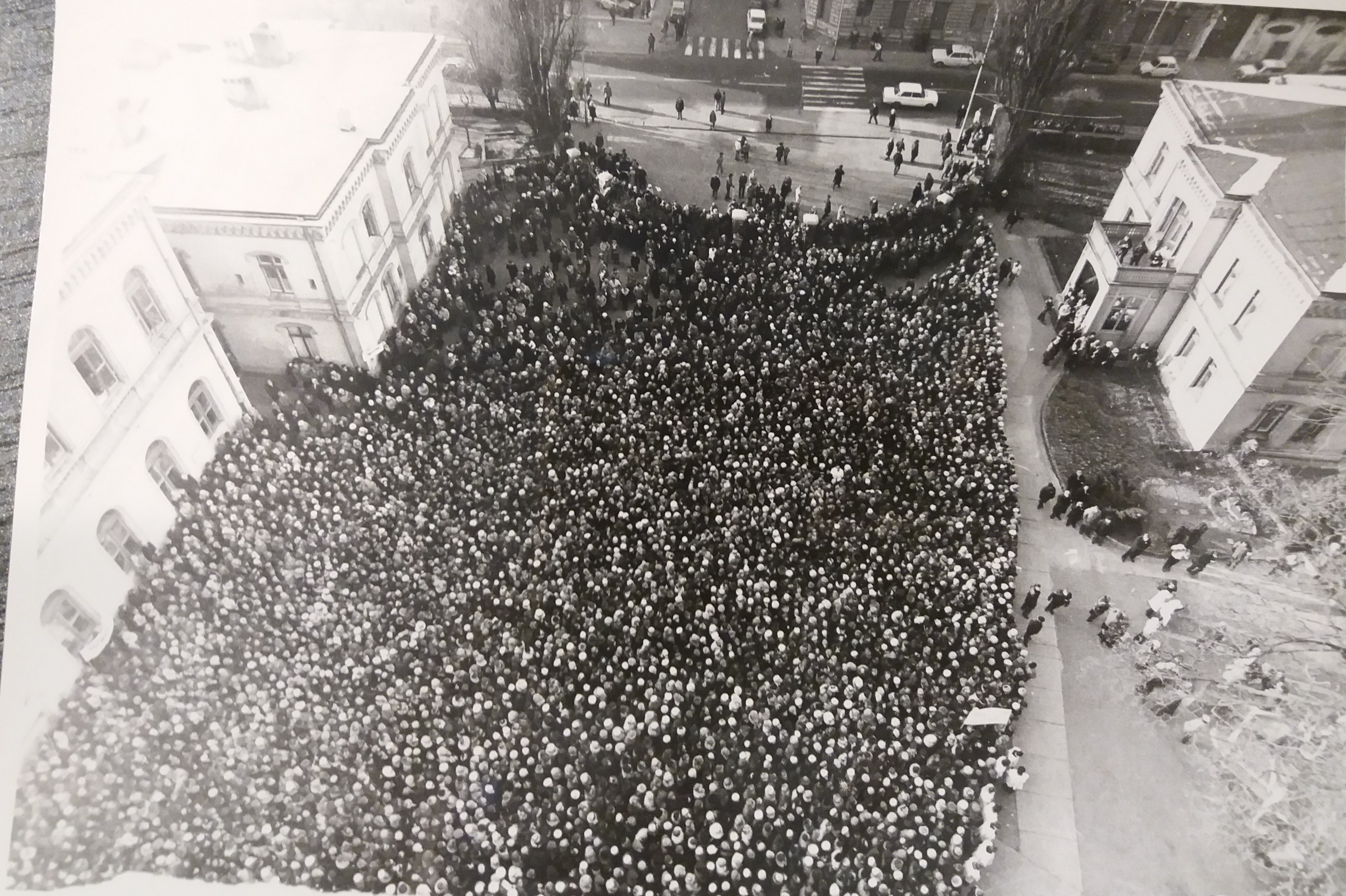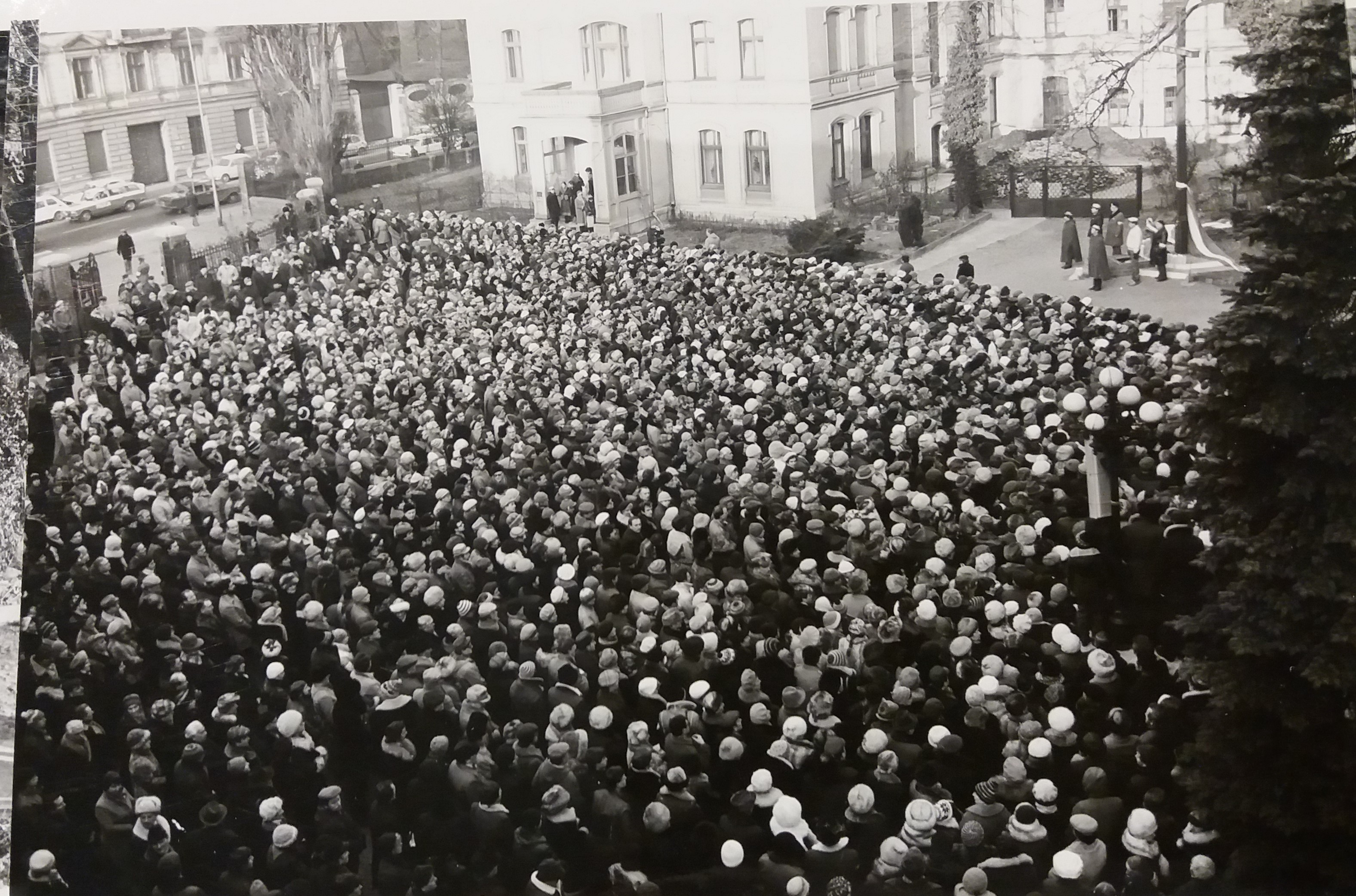 Fotografia przedstawiająca tłum wiernych zebranych na uroczystości u Ojców Jezuitów w Łodzi, 16 grudnia 1984 r. (fot. Archiwum Prowincji Wielkopolsko-Mazowieckiej Towarzystwa Jezusowego w Warszawie)