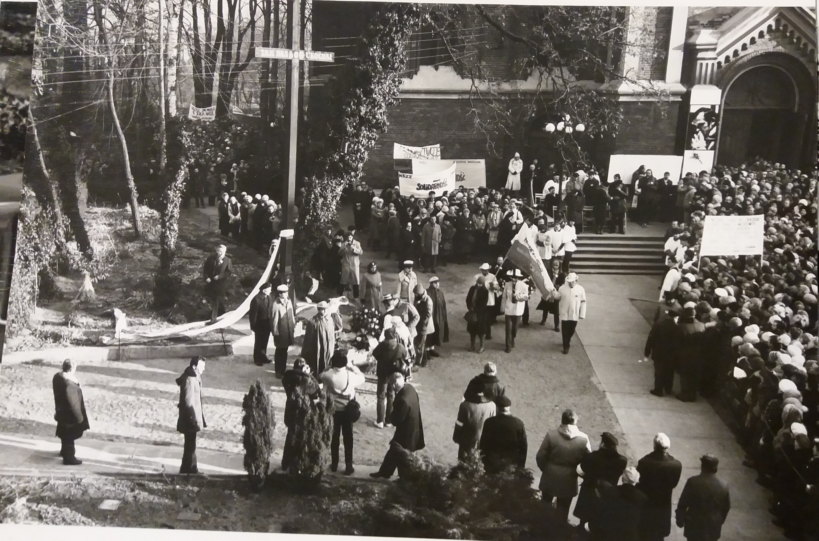 Na fotografii widać tłum zgromadzony pod kościołem. Zauważyć można transparent o treści: "Męczeńska śmierć ks. Jerzego wycisnęła trwałe i niezatarte piętno w sercach naszych. Niech ból ten przemieni się w nadzieję - wierność prawdzie, odwagę i męstwo. Zarząd pracownicy NSZZ Solidarność Ziemi Łódzkiej." (fot. AIPN)