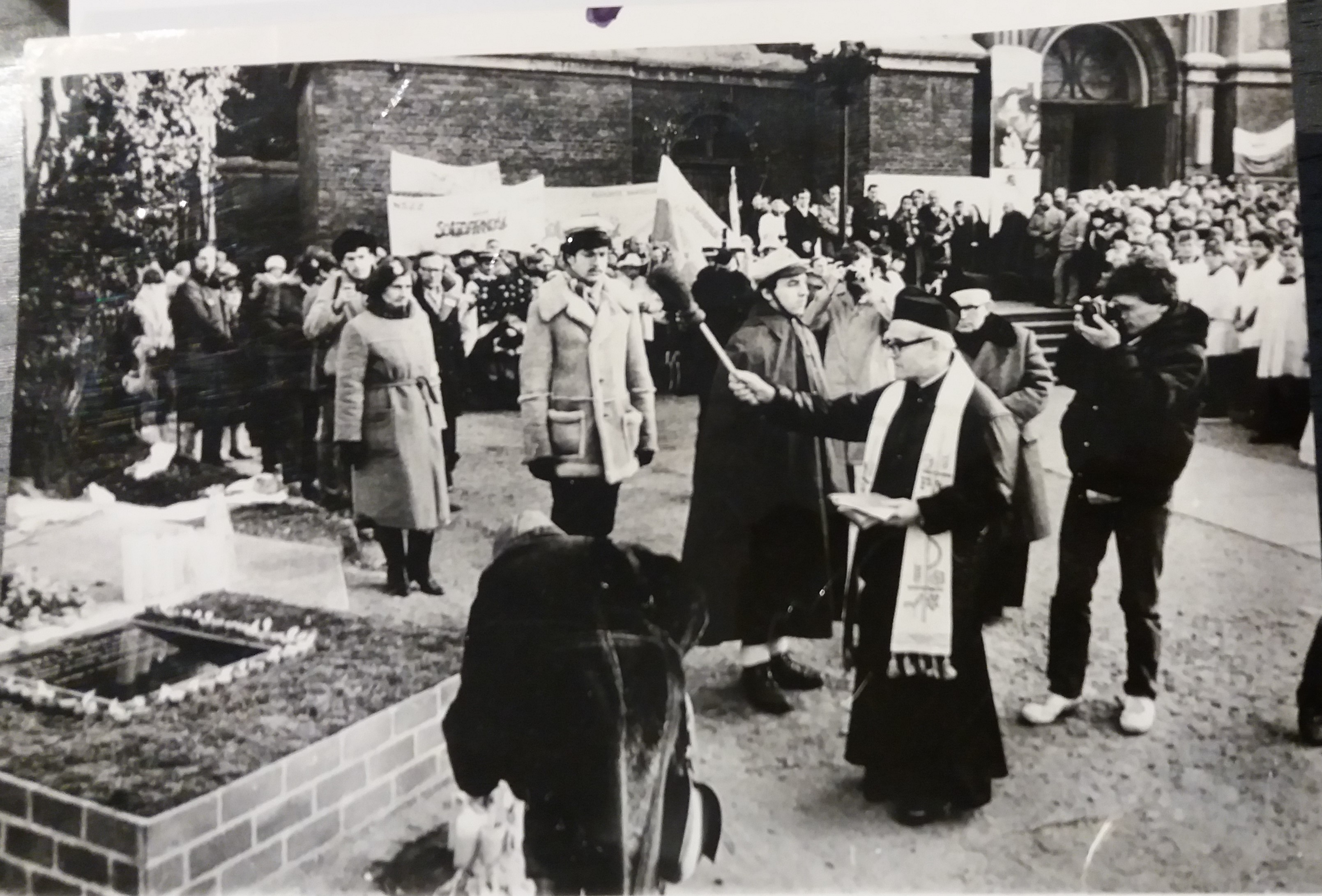 Fotografia przedstawiająca delegację składającą kwiaty pod symbolicznym grobem ks. J. Popiełuszki, 16 grudnia 1984 r. (fot. Archiwum Prowincji Wielkopolsko-Mazowieckiej Towarzystwa Jezusowego w Warszawie)
