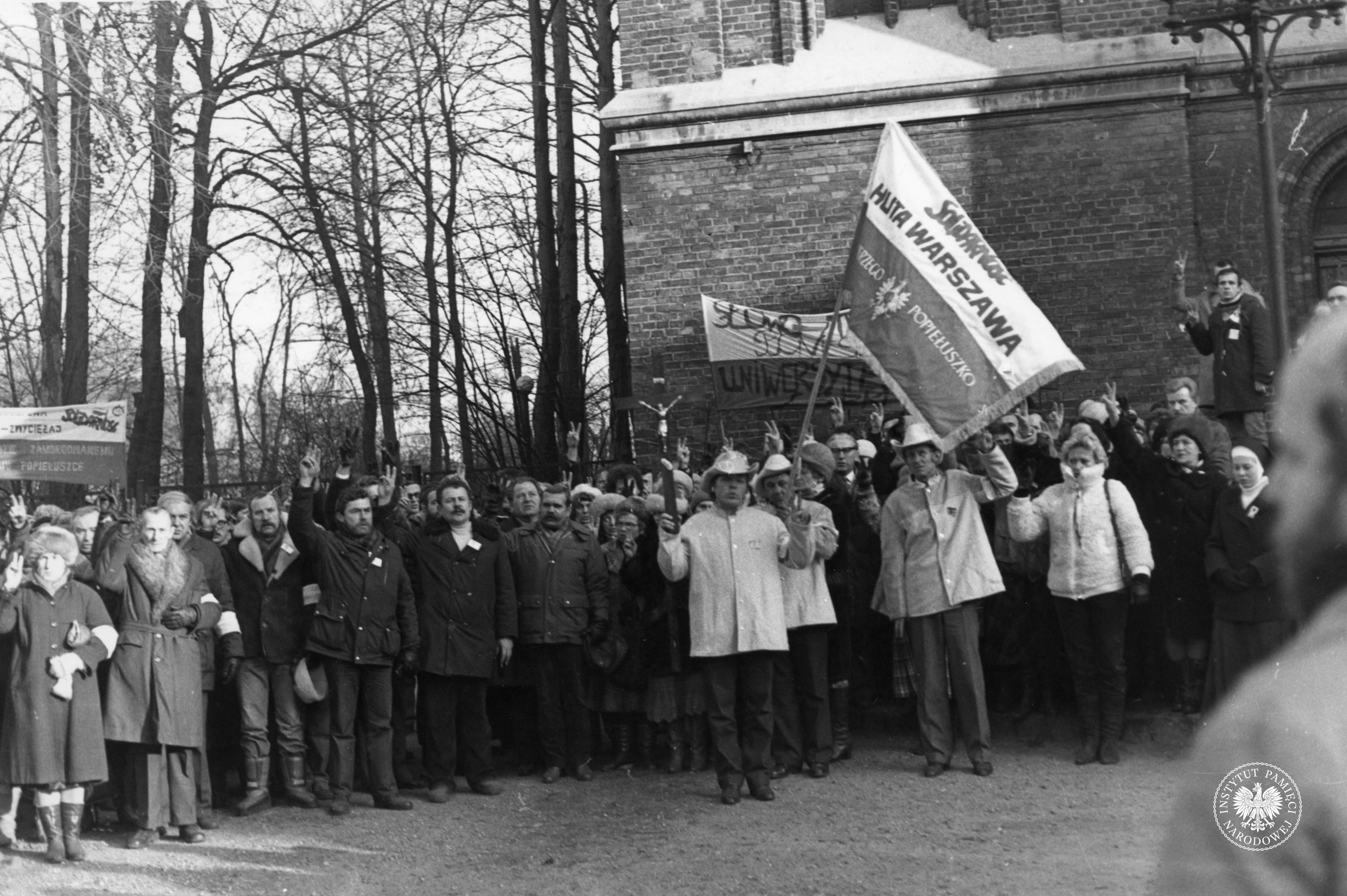 Na fotografii widać ludzi zgromadzonych pod kościołem, w tym reprezentację hutników z Huty Warszawa z zakładowym sztandarem "Solidarności". Część z uczestników uroczystości układa palce w literę "V". (fot. AIPN)
