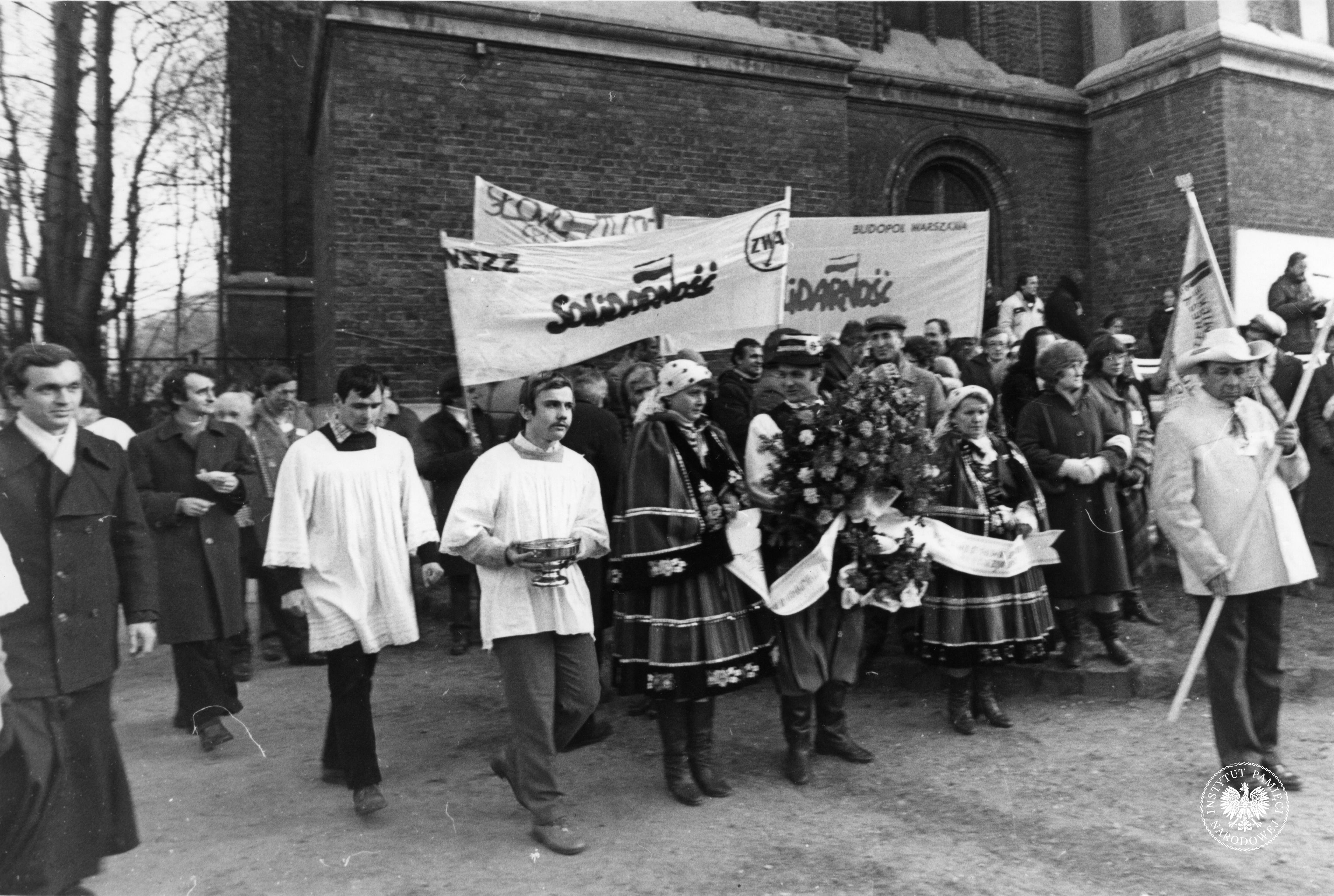 Na fotografii uczestnicy uroczystości - m innymi: mężczyzna i dwie kobiety w tradycyjnych strojach łowickich, księża, przedstawiciele hutników. Widoczne są też transparenty NSZZ Solidarność Budopol Warszawa oraz NSZZ Solidarność Zakładów Wytwórczych Aparatury Wysokiego Napięcia w Warszawie. (fot. AIPN)